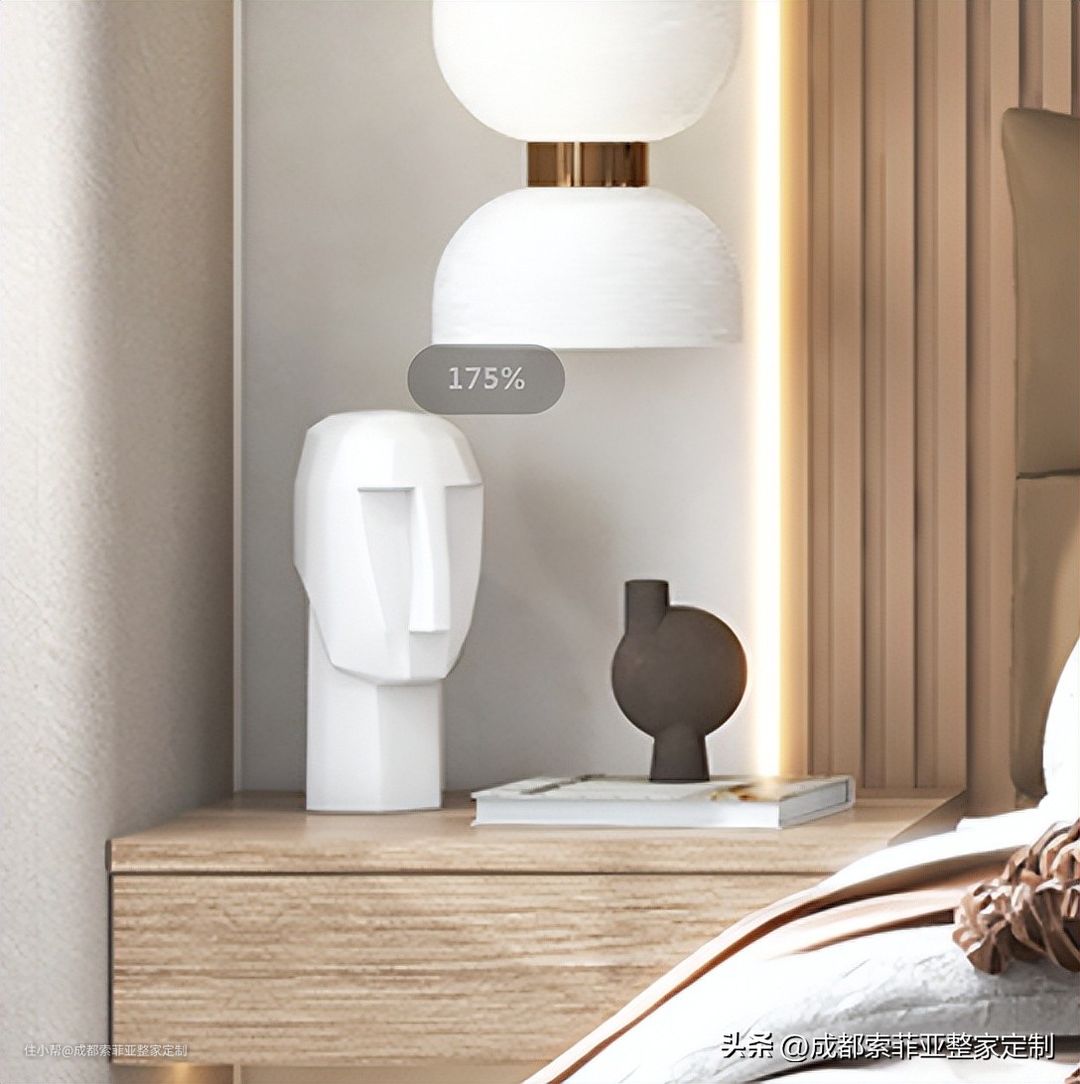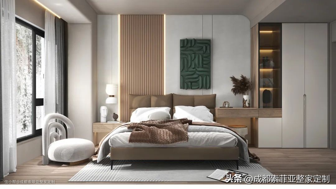 主卧整体素雅的调性,将阳台划分进卧室,放大空间的视觉效果,使得画面描摹出细腻层次,透过窗户将光径流转于每寸边角。极简的舒达皮床,能在视觉效果上拓展卧室空间令人有一种豁然开朗、敞开拥抱的感觉,打破规则呈现出不一样的美感。