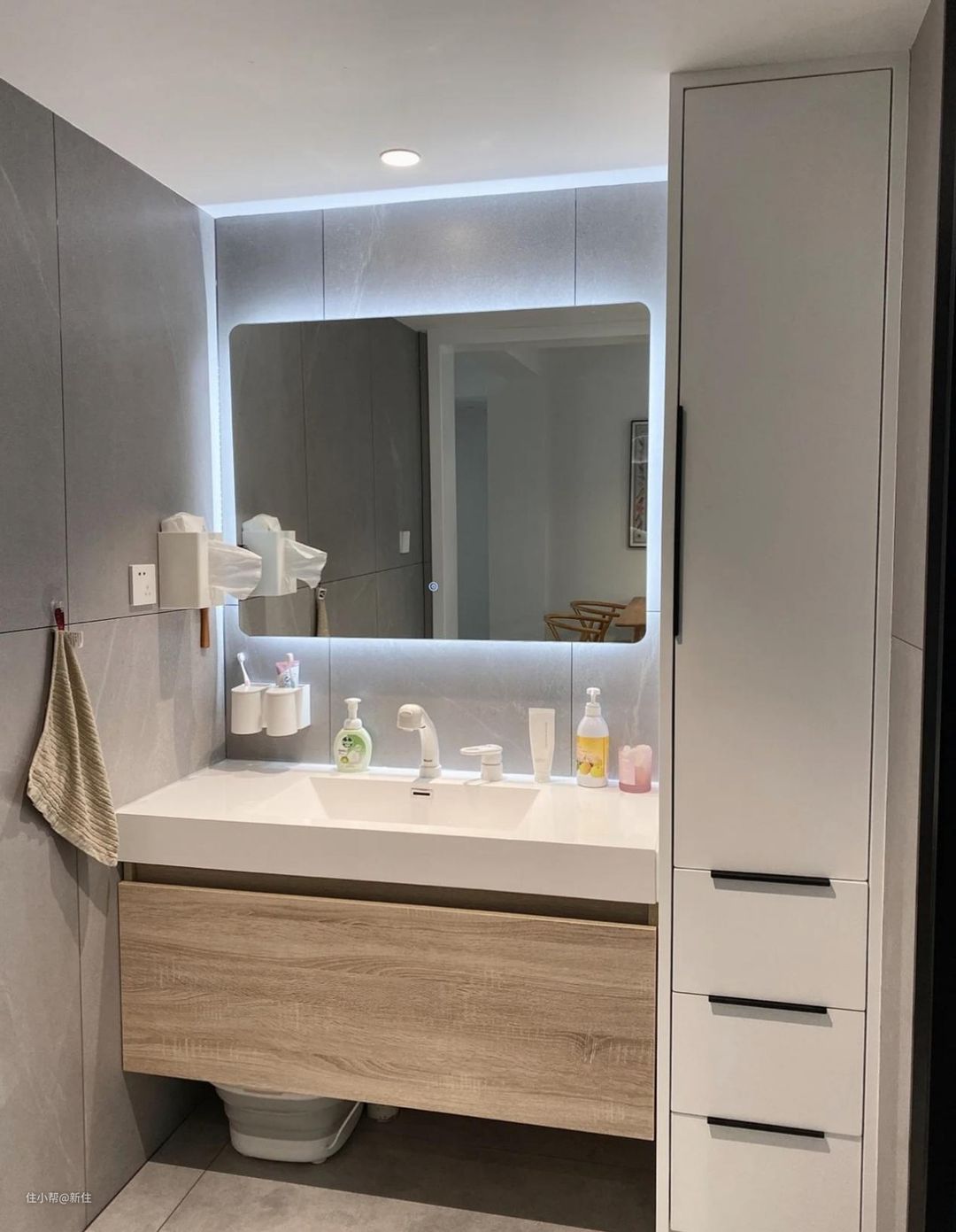 镜子下的背光氛围灯,除了增添氛围以外,在没有镜面灯的时候,也能一定程度上充当脸部的补光灯,用镜柜的时候,还能照亮镜柜下台面的阴影区。