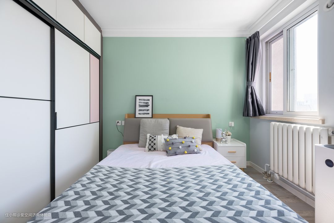 房间的墙面是双色设计,床头背景墙是淡绿色,其他墙面是淡蓝色,渲染的空间氛围清新淡雅,给人一种舒适放松的感觉。