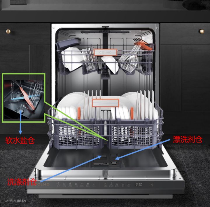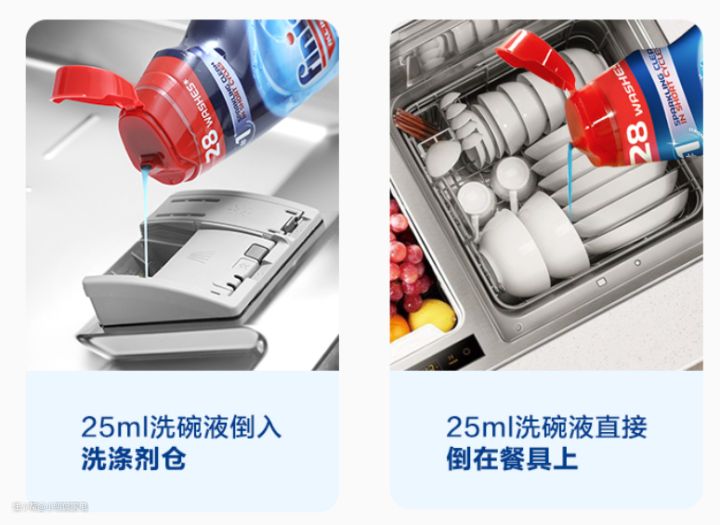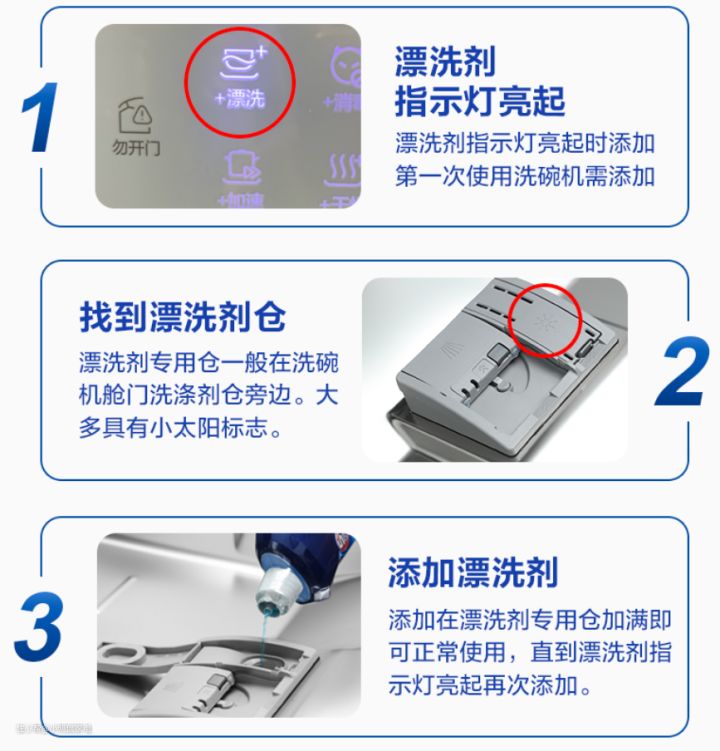 有些不具有漂洗剂仓的洗碗机,建议用多效合一的洗涤剂,一样起到漂洗效果。