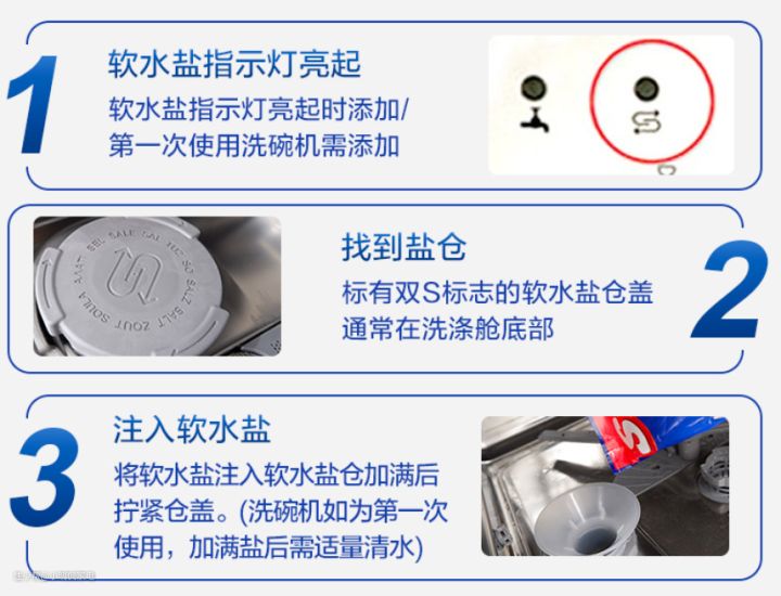 有些没有软水盐仓的洗碗机,推荐使用多效合一包含软水盐功能的洗涤剂,同样起到软水盐的效果。
