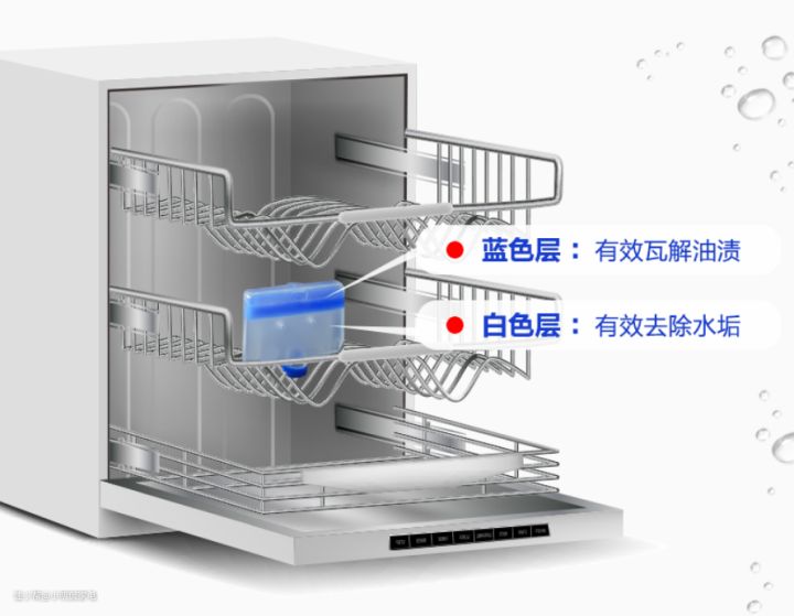 多效合一洗碗块含有软水盐和漂洗剂,基本不需要额外添加软水盐和漂洗剂,特别适用于不带软水盐仓和漂洗剂仓的洗碗机。