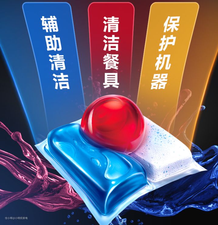 洗碗凝珠具有软水盐功能、漂洗剂功能、机体清洁剂功能,不仅能够洁净餐具,还能养护机体。