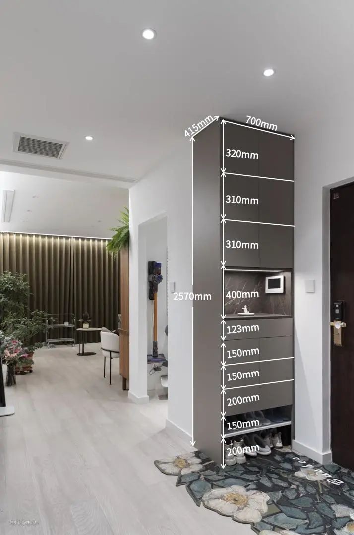首先可以与家里的家务区结合起来,最常见的就是在玄关处打造一个微型储物间。比如逯薇老师提到的「玄关800库」,就是这个作用。
