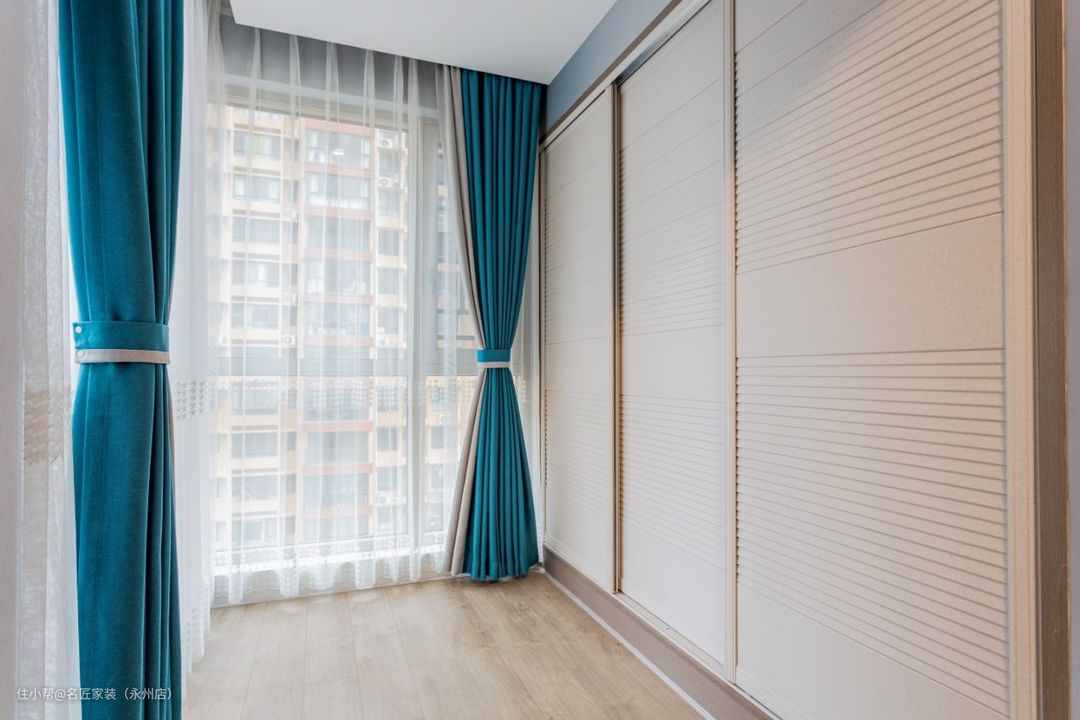 阳台区域也是女主人的独立衣帽间。设计落地大窗户,让景观和光线都充分投放进来,让卧室变得非常敞亮。靠墙一侧设计了推拉衣柜,温柔的米白色与木地板相融合,给人非常温润是舒适感。#阳台#衣帽间