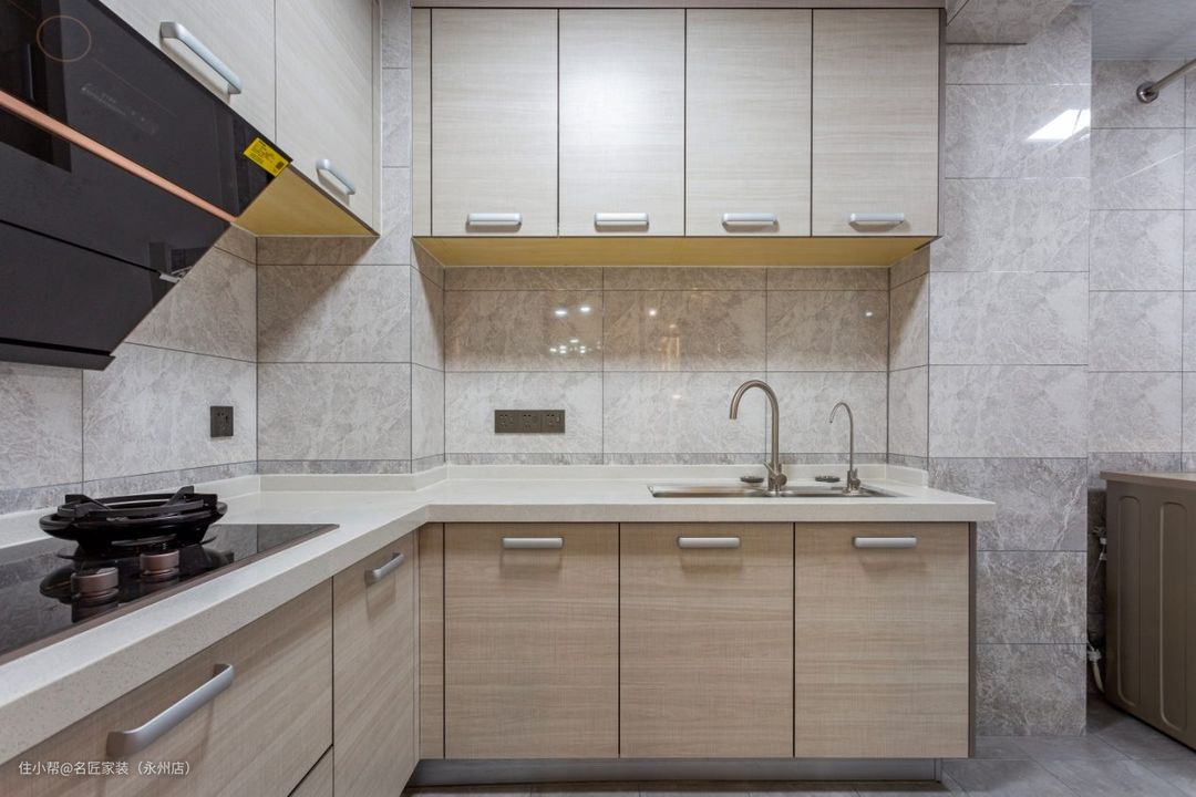 厨房的设计简洁实用,从腰部位置分成两个色系,上方选择白色瓷砖,下方铺贴浅灰色花纹瓷砖,做一个视线的分层,增加厨房的空间高度。整体颜色均选择浅色系,与全屋风格搭配的同时,也保证一个简洁大方的特性。上下都有设计米白色橱柜,收纳空间充足,非常实用。#厨房#橱柜