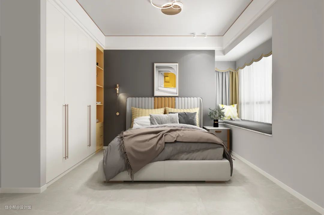③床侧边的衣柜,做成嵌入式设计,衣柜侧板有了一面墙的“依靠”,让衣柜看起来更加结实,并且没有侧板的 存在看起来也美观不少。