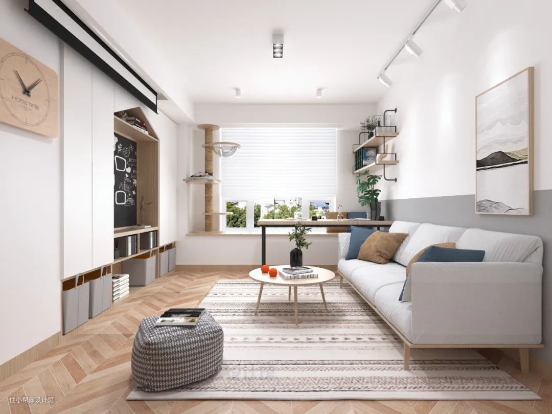 ②客厅电视墙左侧是墙体,把定制柜子嵌入进入,柜子与墙面齐平,大大削弱了衣柜的体积感,增加空间舒适感。