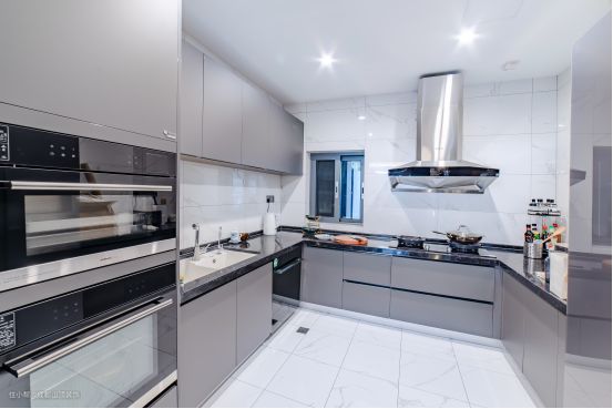 设计亮点:为了更好地利用厨房的空间,设计师采用U型布局方式,让厨房动线更加简洁流畅,并加入西厨功能,将蒸烤箱嵌入柜体,满足女主人偶尔做西餐、糕点的小爱好。厨房空间以灰白色系为主,显得空间沉稳有序、干净整洁。
