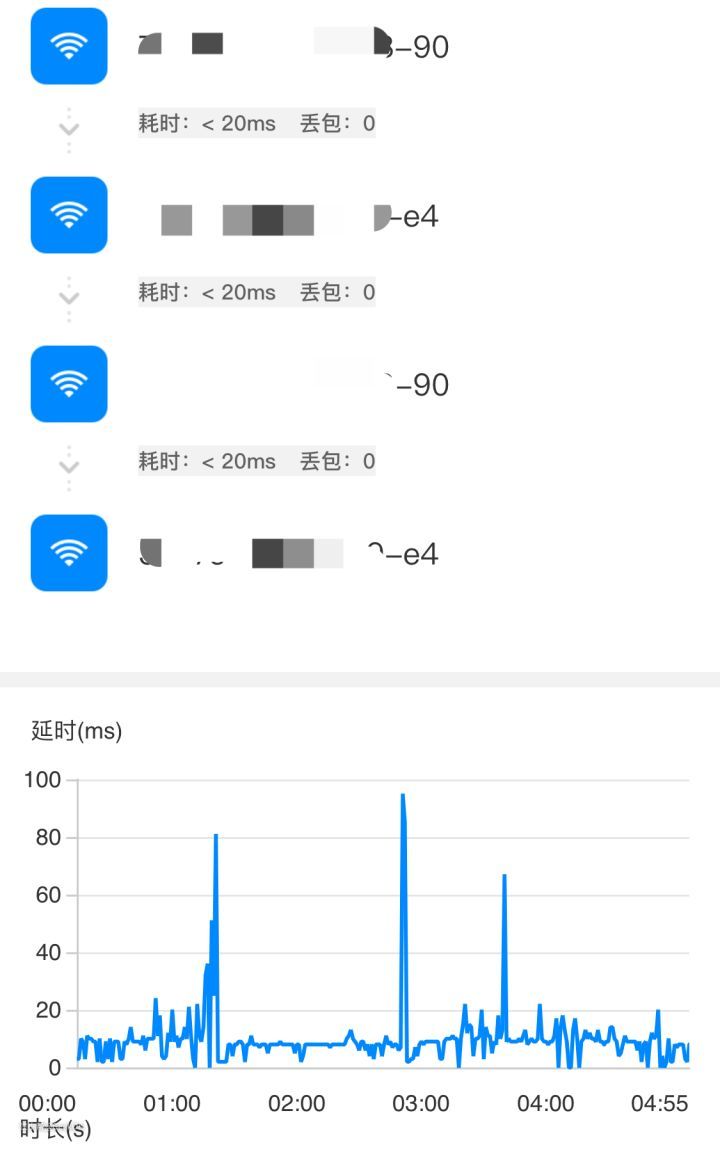 这两个路由器均支持802.11kvr,使用了相同的ssid和密码,一台为华硕(asus),一台为网件(netgear),未组mesh。可以看到二者之间切换相当流畅,切换耗时不超过20ms,切换过程中的感知最大延时不超过100ms,完成切换后延时基本保持在20ms以内。