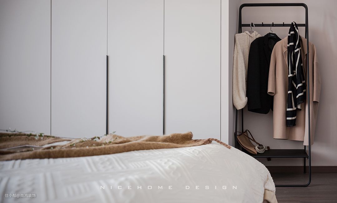 而拉低衣柜颜值的另一大关键是地板和衣柜哪个先装,你千万不要为了省一点地板的费用去先装衣柜,这会得不偿失,因为后期安装收口只能用扣条压边,会显得丑还不整体。记得要铺地板再装衣柜,不用做多余的处理,简单还省事;而且住了几年你想再换衣柜也不需要担心会再重铺地板,导致颜色不一致的苦恼了。