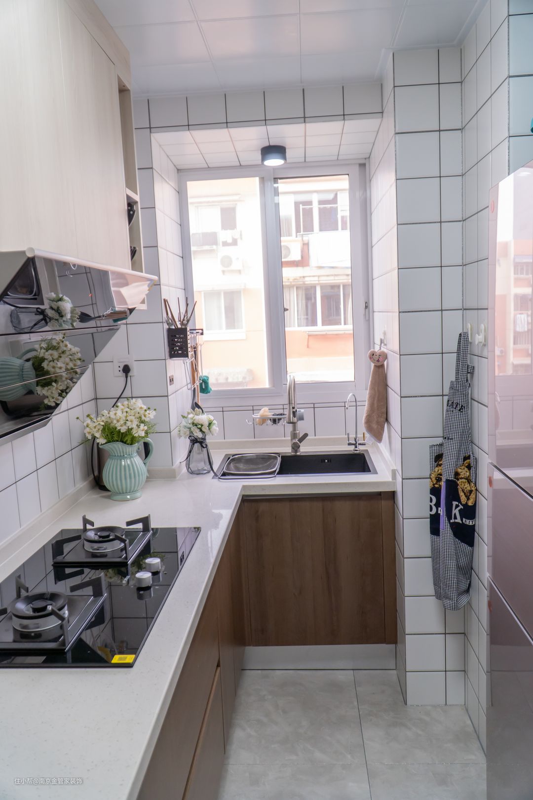 L型厨房明亮通透,墙面贴白大理石瓷砖,给人一种纯净通透的感觉,大量的白色瓷砖铺贴可以让空间显得宽敞通透不少。