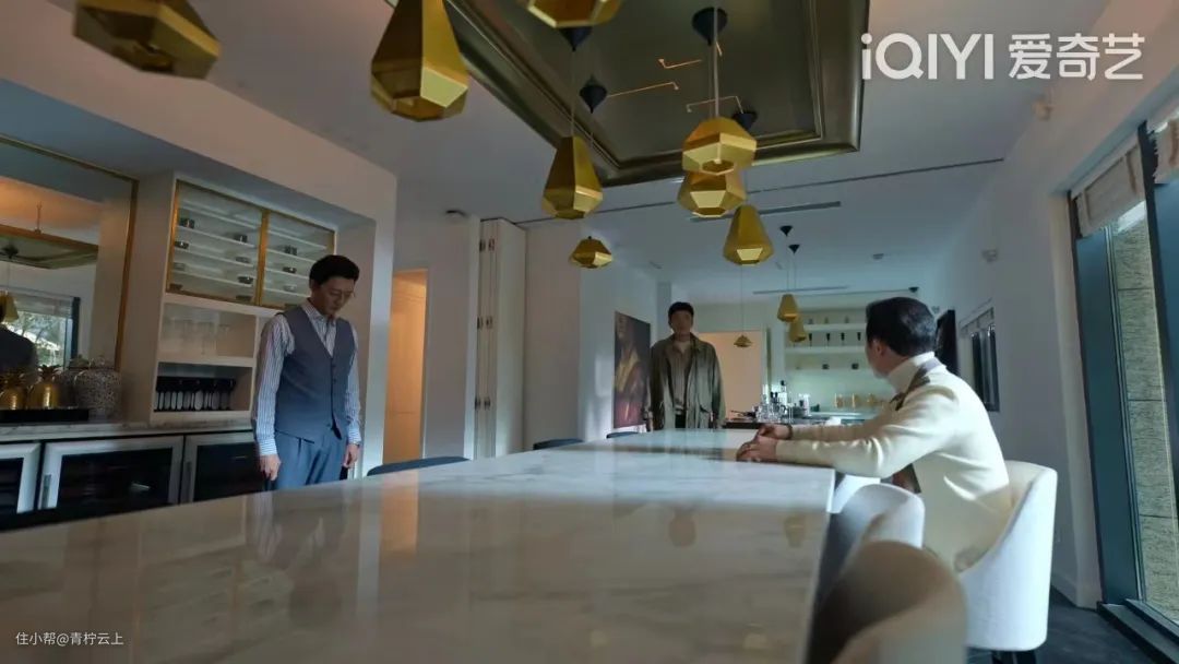 灰色的布艺沙发,搭配简约风茶几,茶几上摆着一套茶具,从老破小到豪宅,高启强喝茶的习惯一直没变。客厅内还设计了一个小吧台,日常高启强和小弟们喝酒很方便。