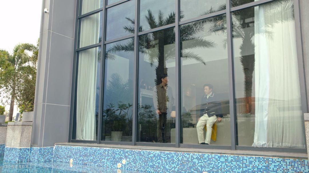 别墅的外立面设计,是浅色石材和玻璃元素的结合,是典型的现代主义别墅设计。别墅一共三层,从剧照来看顶楼应该还有一个超长阳台或露台,屋顶以条状结构营造出设计感与光影关系。
