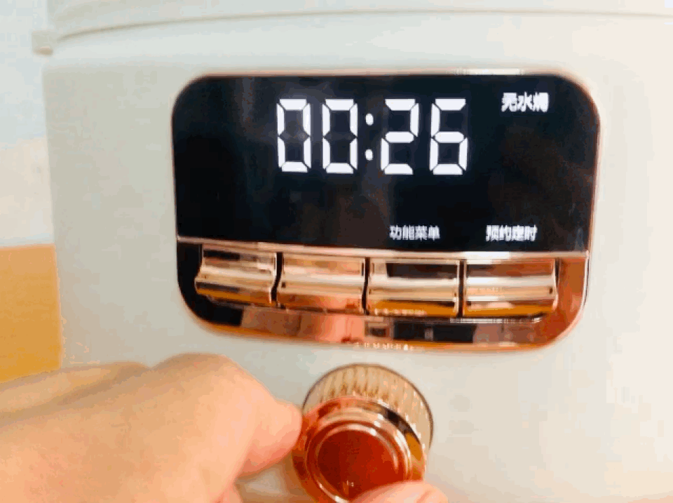 那颗加大码的旋钮特别显眼,主要功能是复位计时和火力调节,当你选择错误或想结束当前选择,轻按一下旋钮取消设置,压力锅回到开机状态。旋转旋钮可以设置烹饪所需时间,不过重要功能还是藏在功能菜单键里。
