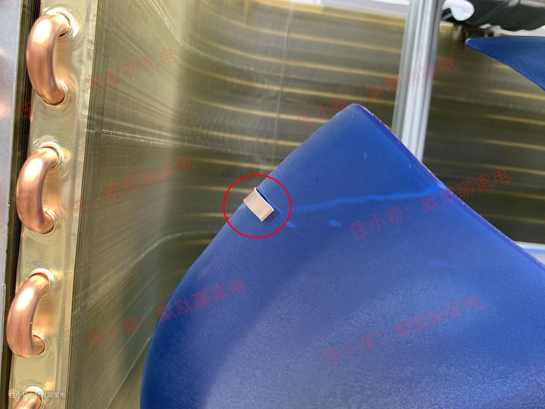 外机风扇扇叶上带有金属配重块,做过动平衡,目的也是为了风扇转起来更平衡不产生振荡而带来噪音,跟汽车轮毂上的配重块是一个道理。