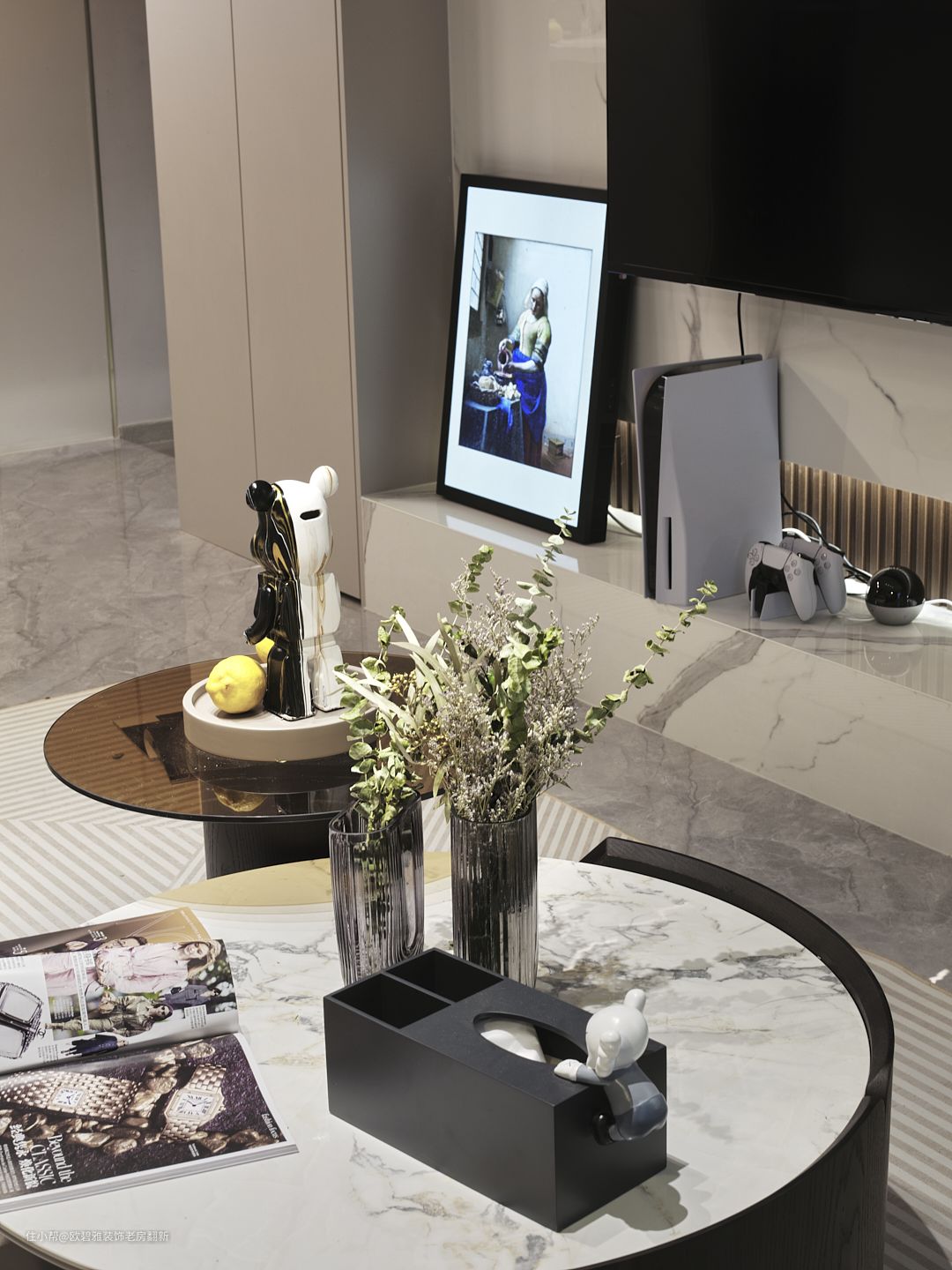 全屋通铺一样云纹大理石地砖,提高空间完整度。米白色地毯在客厅大面积铺设,温柔舒适氛围感营造。即使在整体用材和用色比较硬朗的情况下空间也不会显得冰冷。