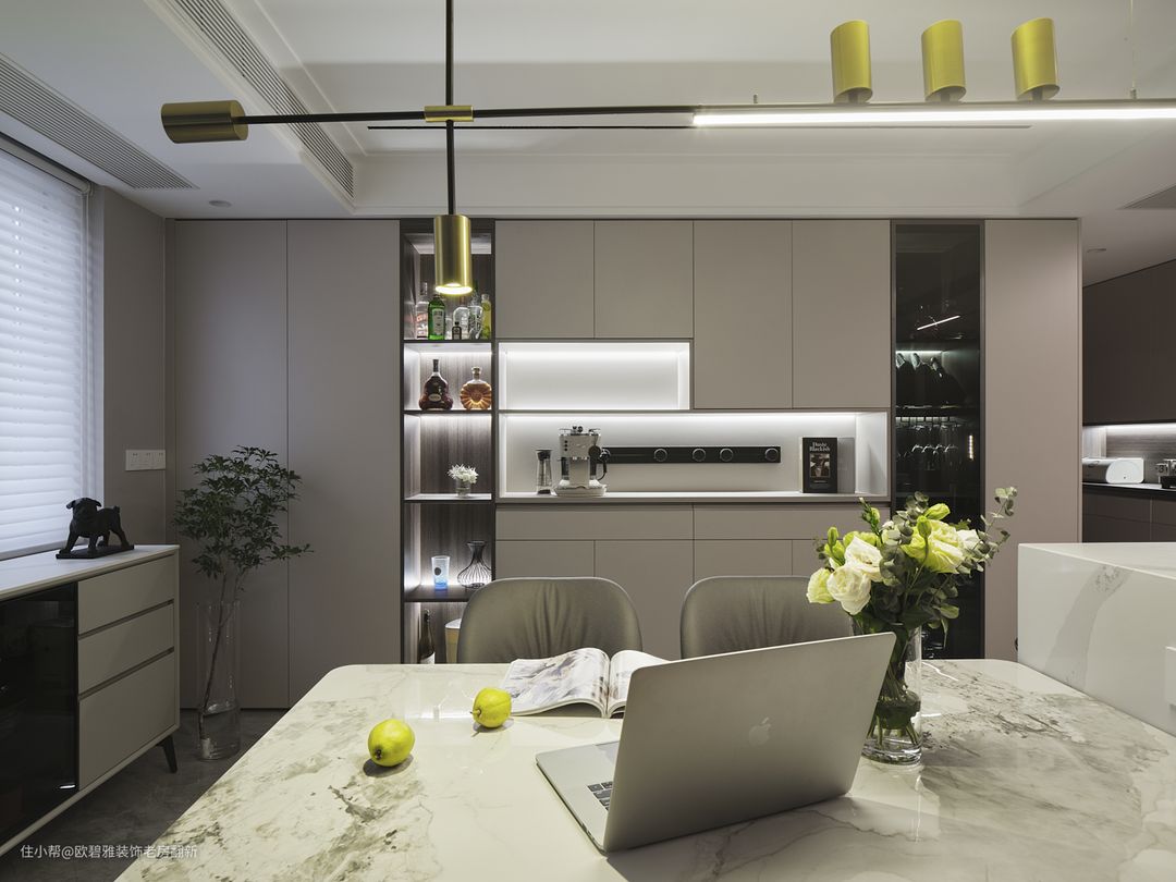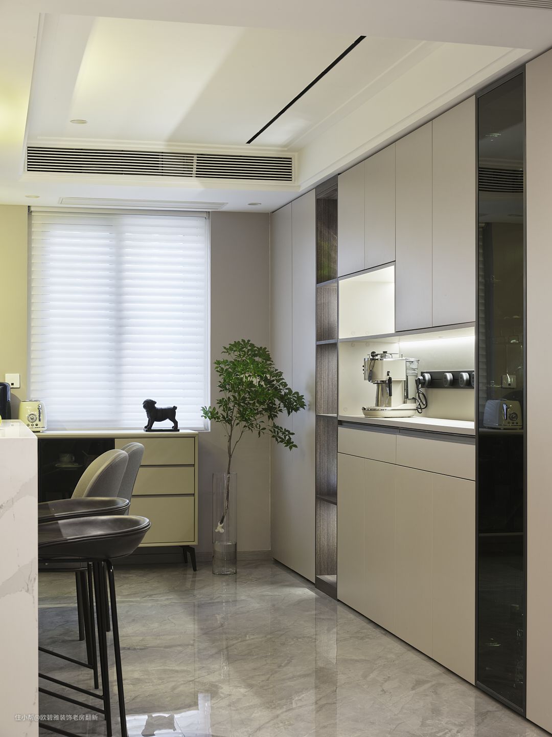 餐厅一旁的柜体设计,一是为了提高餐厨区的整洁度,增设更多的储物空间。另外一个就是增设咖啡区,平时业主夫妻在餐桌这里办公,冲泡一杯咖啡为家庭work增加些惬意感~