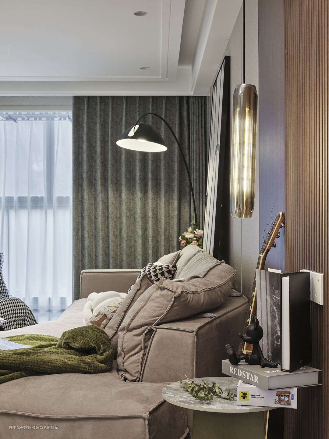 黑色落地灯营造了沙发一角的氛围感,灰白搭配的窗帘用作白天和晚上不同的遮光需求。无论是从客厅整体还是局部细节都通过软装的搭配与呼应将空间完整度提高。