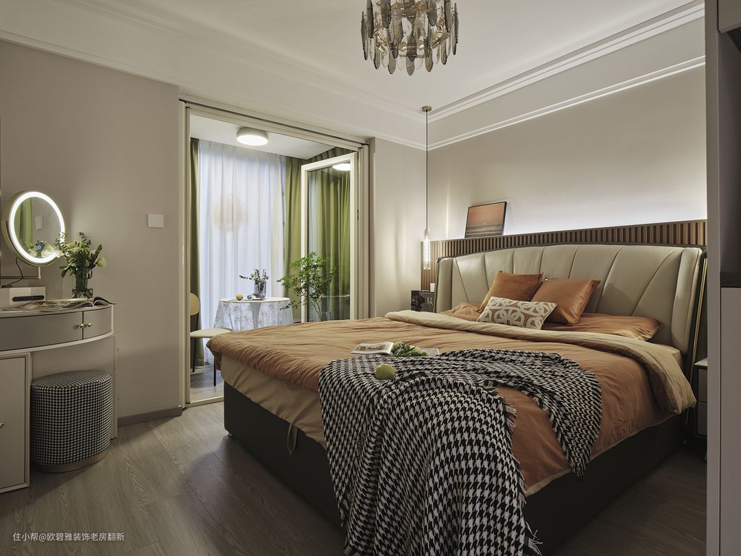 床头胡桃木硬包+贝壳形床头在氛围灯的光线投射下营造出极强舒适感。黄铜元素的主灯+氛围灯造型呼应了整体的轻奢现代感,棉质的细腻,与阳台的自然观景相得益彰。利用床位一处设置了梳妆台供女业主使用,卧室将每一隅都利用到极致。