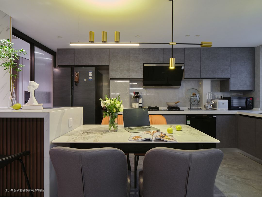 厨房改造亮点:开放式厨房加回形动线空间更显大。中西厨结合的设计,利用餐厅岛台新增西厨区,餐厅餐桌也可做厨房操作台使用。为了保证厨房和餐厅空间相对独立的同时还保持空间感,这里采用餐厅厨房并联的设计,互相借光仅用软装来做区域空间分割。
