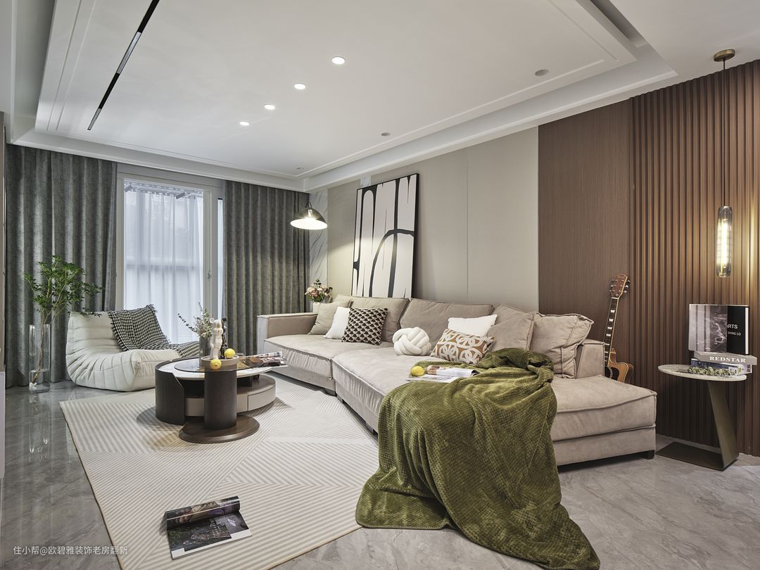 客厅面积30平、四米的沙发视觉感上有延伸,一体式的背景木饰面结合木格栅增加空间层次感.、悬浮式吊顶的运用 空间层次感有所提升,搭配浅色瓷砖整体光感强烈色调由复杂变的统一。