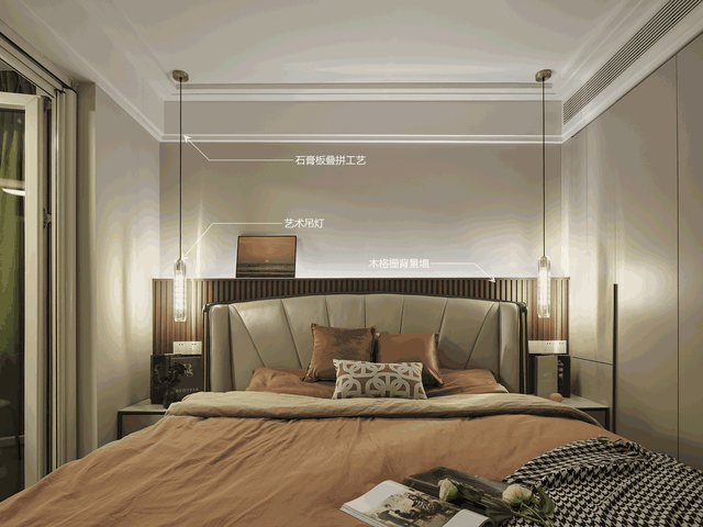主卧是屋主夫妇日常休息的空间,追求细致入微的舒适体验。在设计取色上结合业主的喜好,以焦糖色+原木+复古绿为主辅色彩关系,以及和客厅一样的色系和浅色线条背景加入其中,配合全屋漫反射光源。