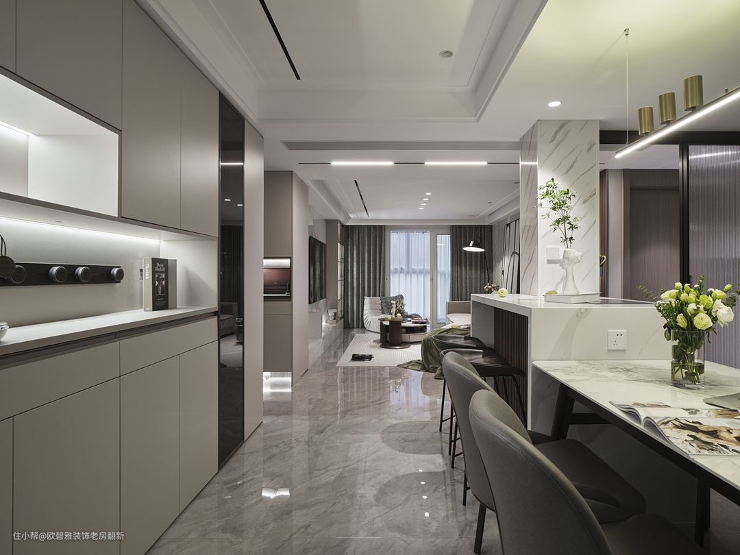 改造后的玄关,云纹大理石地面改善了相对暗的过道,也提升了空间层次 。玄关置物台随意摆放的托摆件也给空间增添了几分玩味意趣。