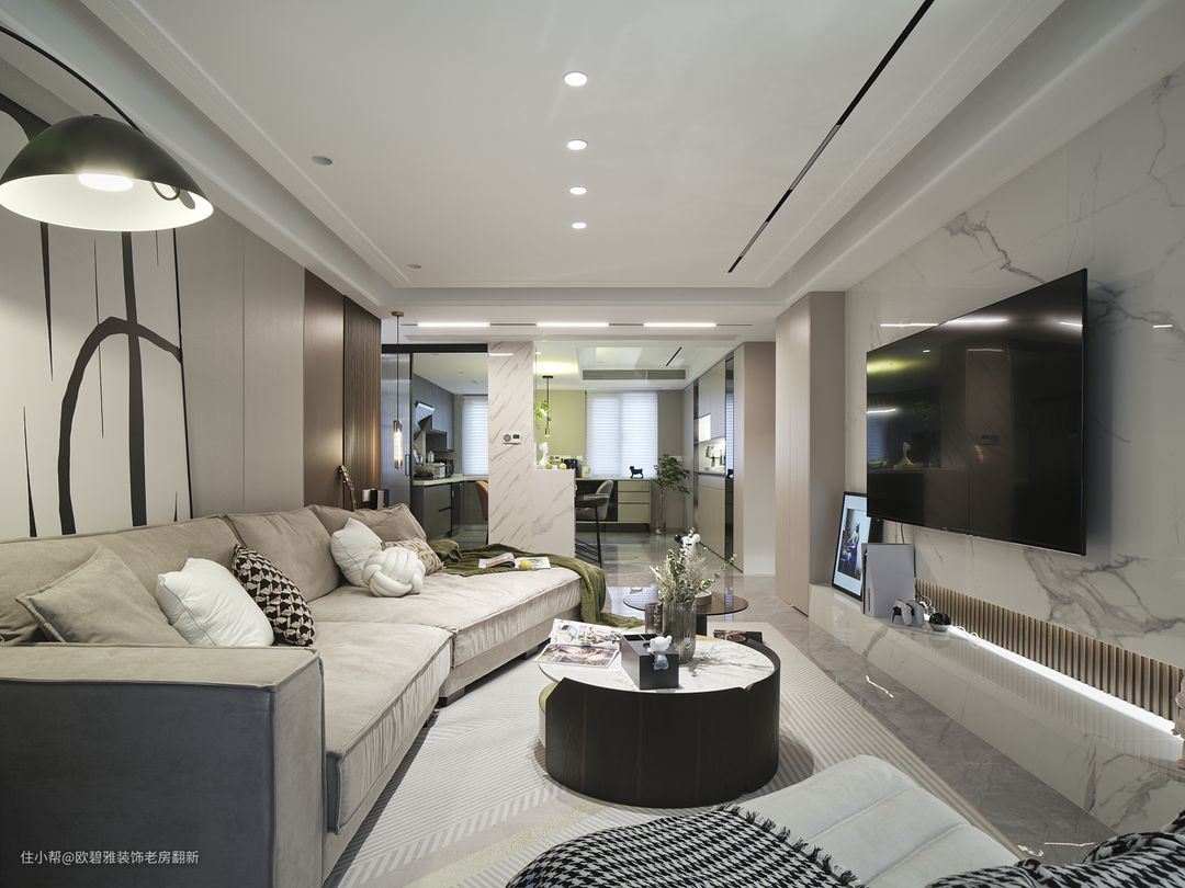 ◐客厅改造亮点:一体式背景与电视墙加悬浮吊顶增加了空间层次感
