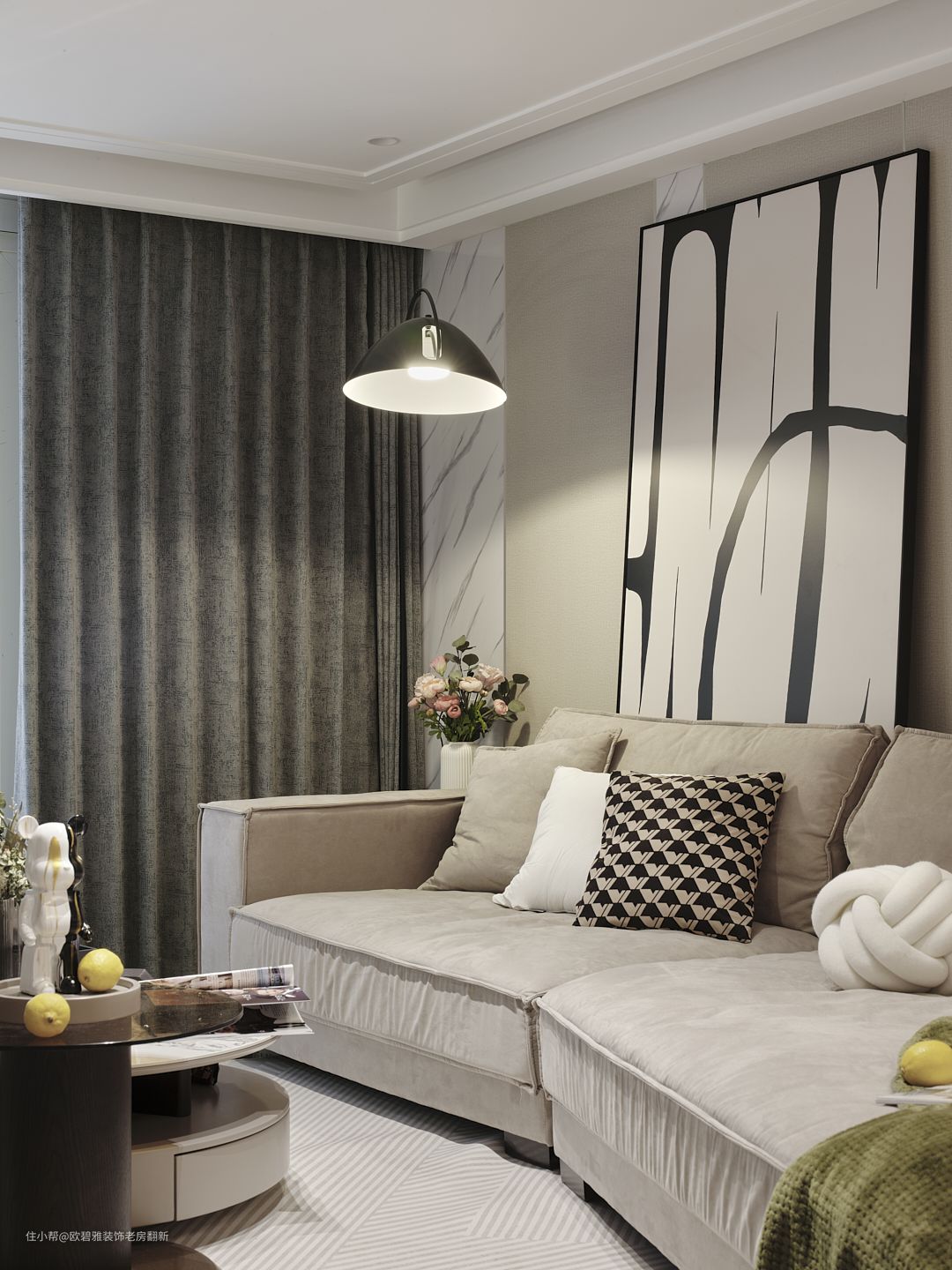 通透感十足的客厅,无主灯设计元素是现代和轻奢风格的凸显。灰白科技布沙发,奠定了客厅的主视觉输出,搭配巨幅轻奢风十足的黑白纹理花;空间低调的奢华感就呼之欲出了。