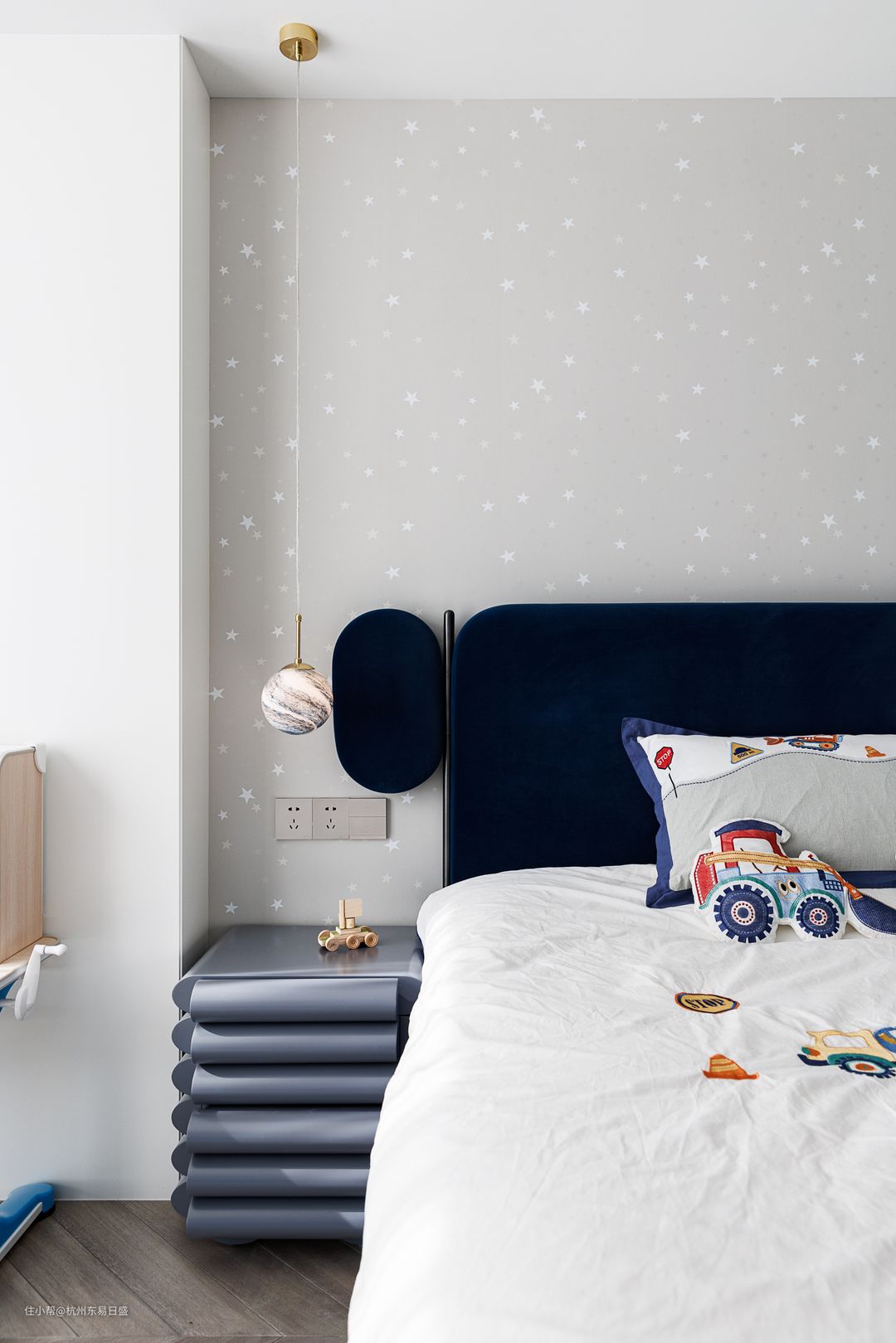 终极的浪漫是宇宙的浩瀚。蓝色系的儿童房作为用色例外,用天空的颜色来装饰酣甜的梦乡。两侧的整体衣柜足够陪伴成长,栩栩如生的各类摆件装饰,是来自长者的温柔寄语,留存下孩子天马行空并弥足珍贵的梦想。