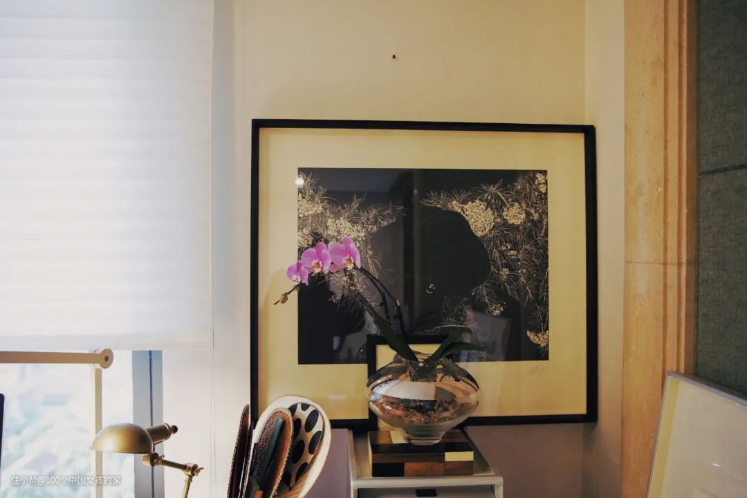 靠近书桌有幅冷冰川的石版画《夹竹桃》,是她目力所见描临祖师奶奶张爱玲最有神韵的作品。因为张爱玲是她小时候的精神偶像,特意把它放这里,对自己也是一种激励。▼