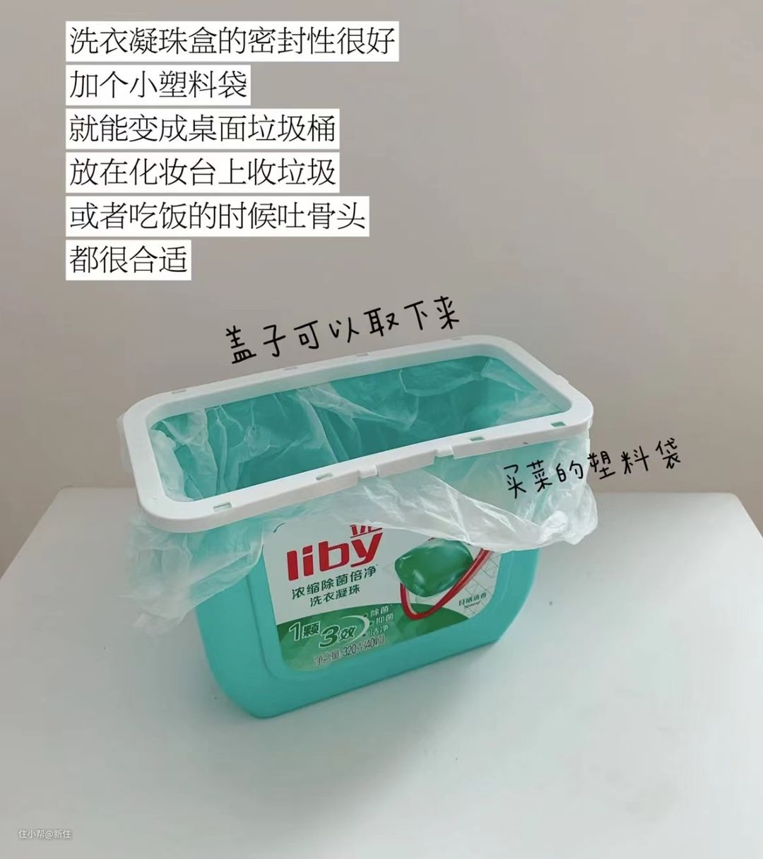 比如,盒盖上带压圈的洗衣凝珠盒,作为桌面小垃圾桶很完美。