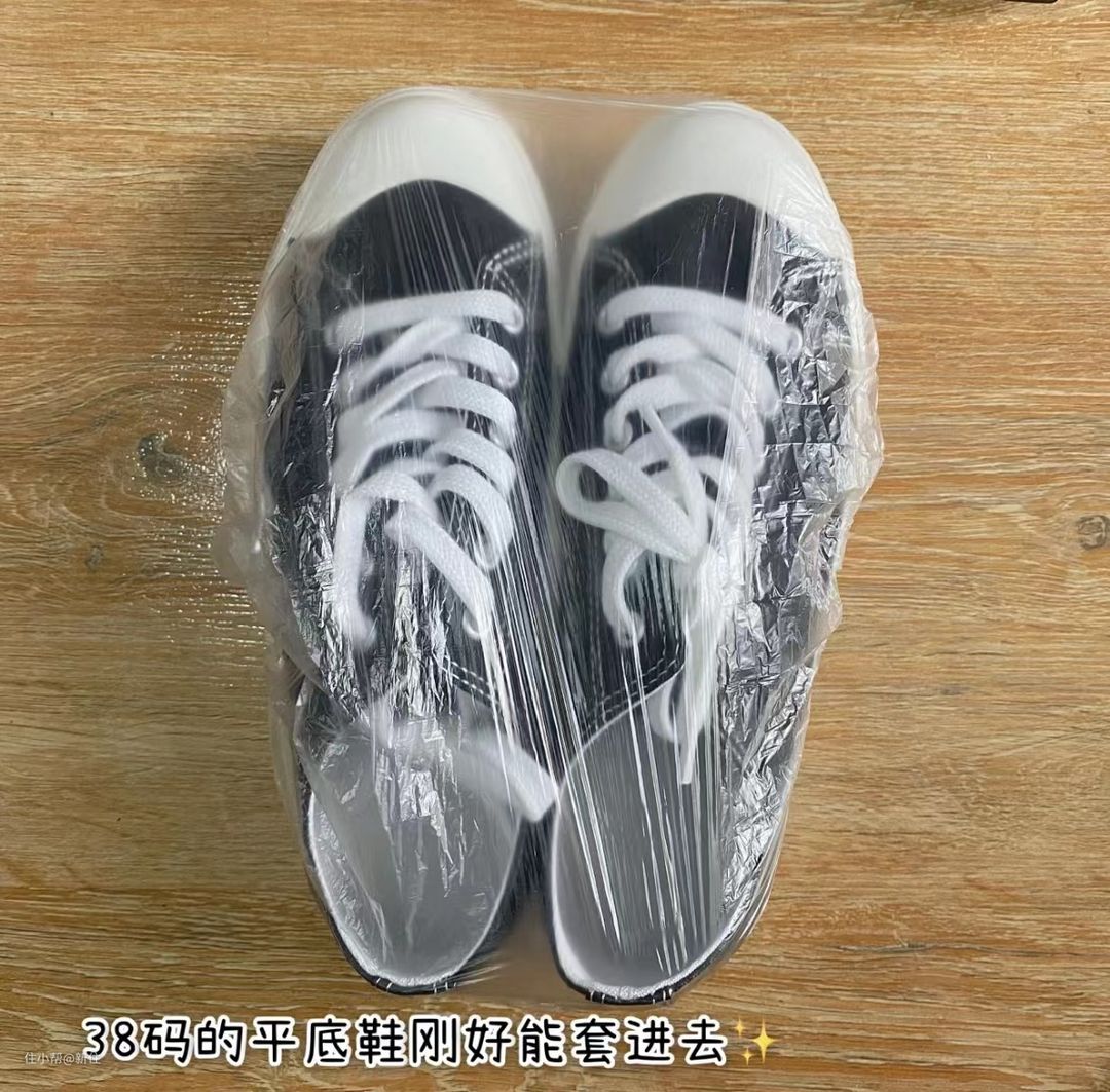这个保鲜膜套,平时是用来套盘子的,没成想用在鞋子上也是这么合适,38码的平底鞋套上去刚合适。