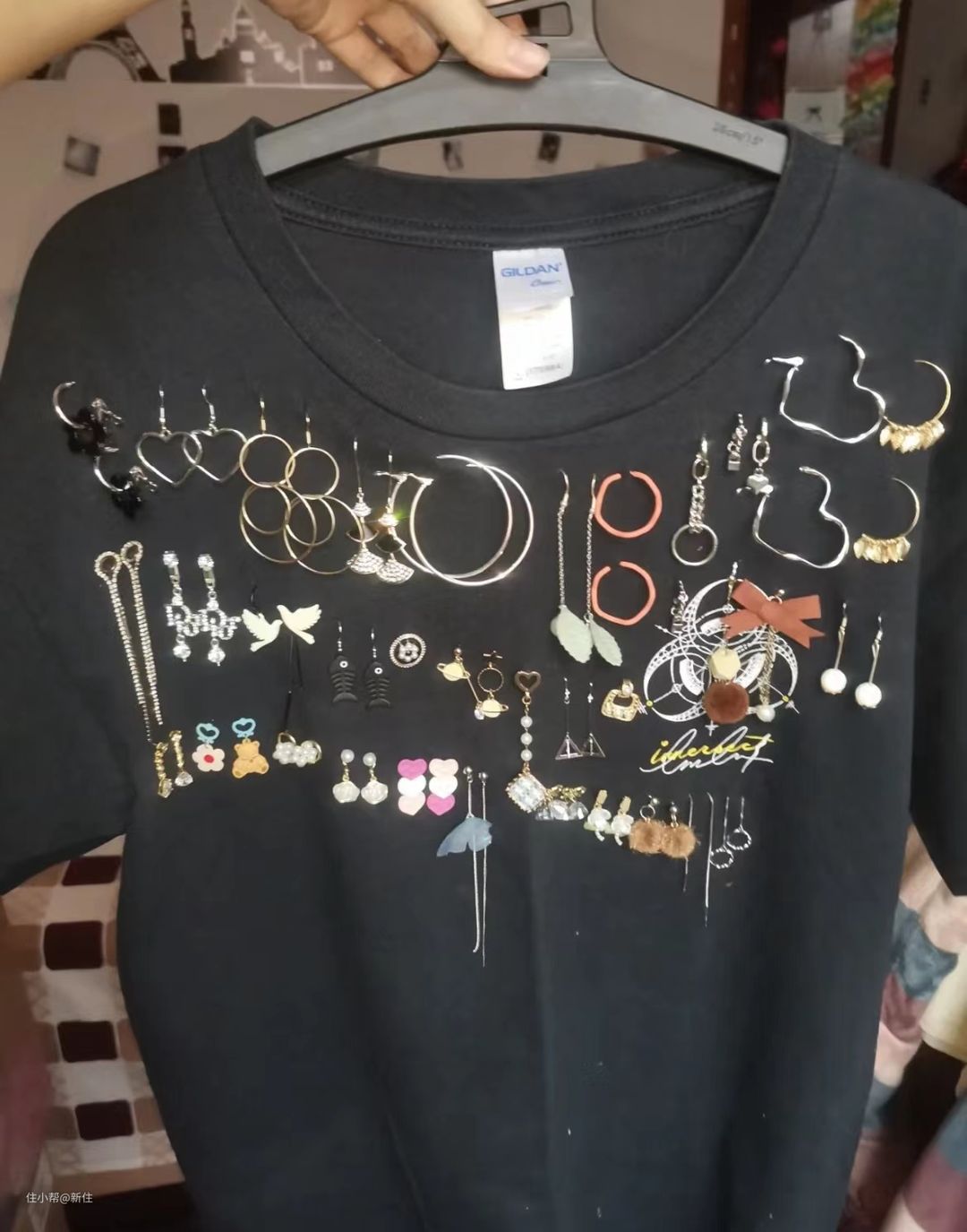 因为它本身梳齿根根分明,项链挂在上面有分隔的功效,不会发生缠绕,而且,小的空隙,刚好能穿过耳钉,也太奇妙了。