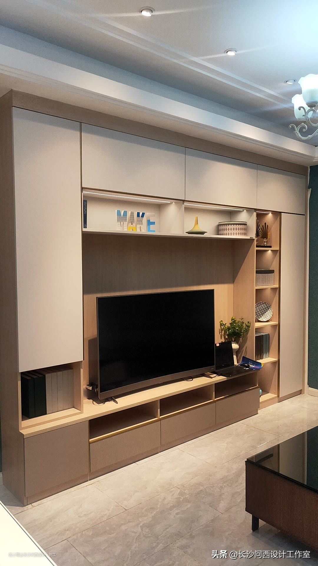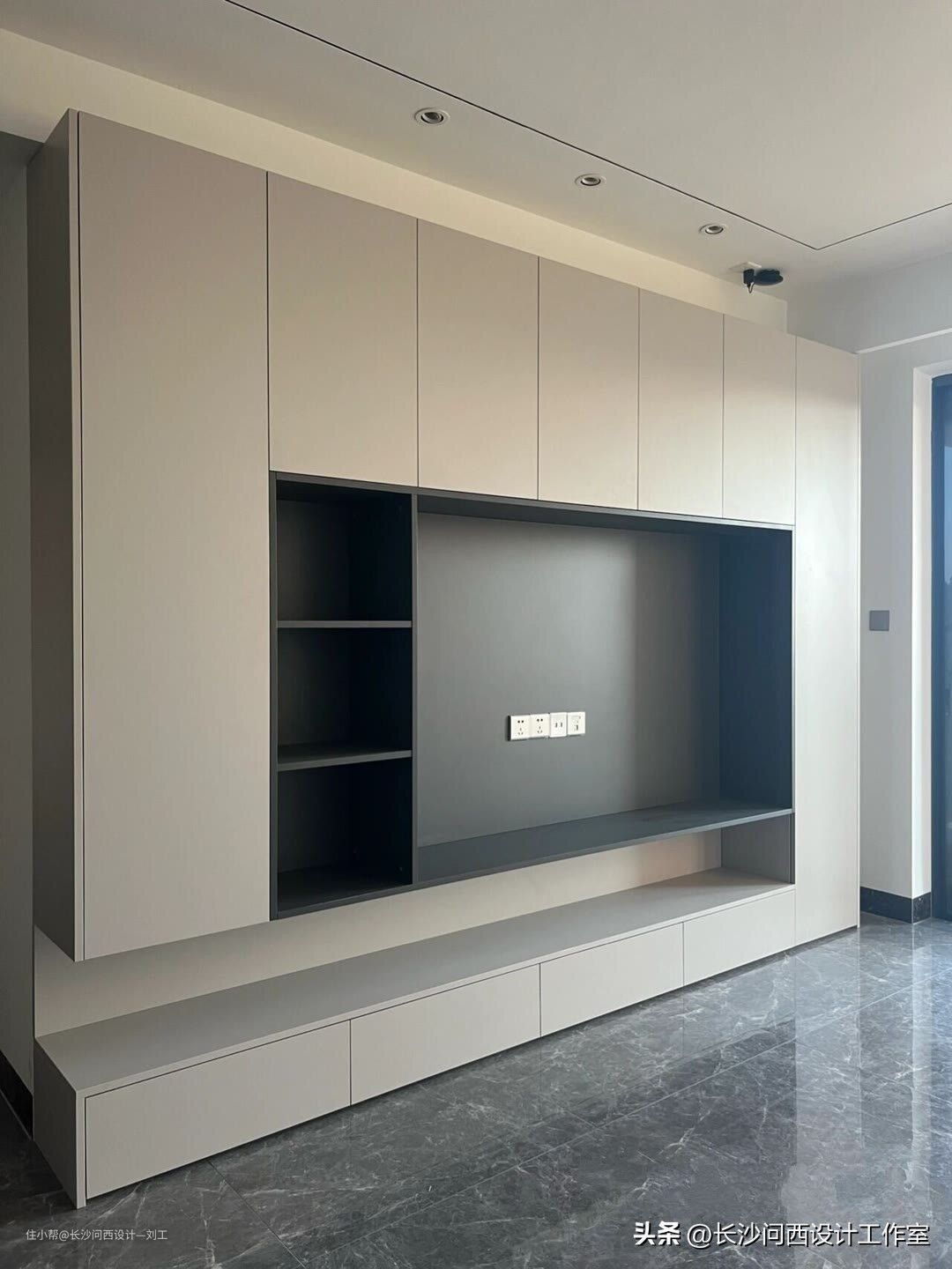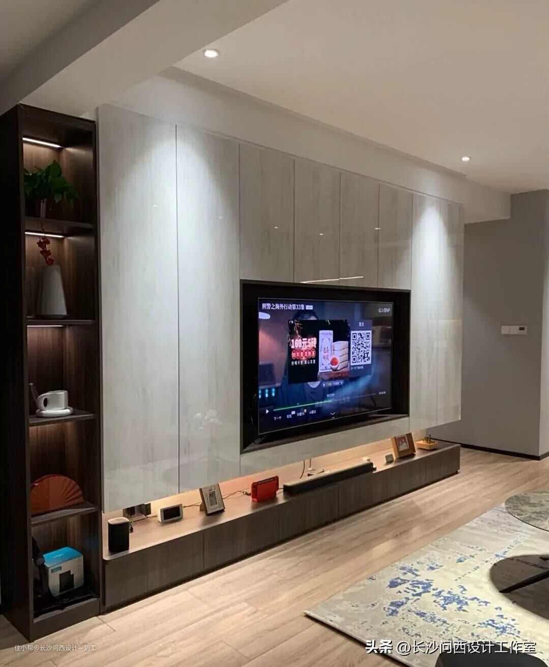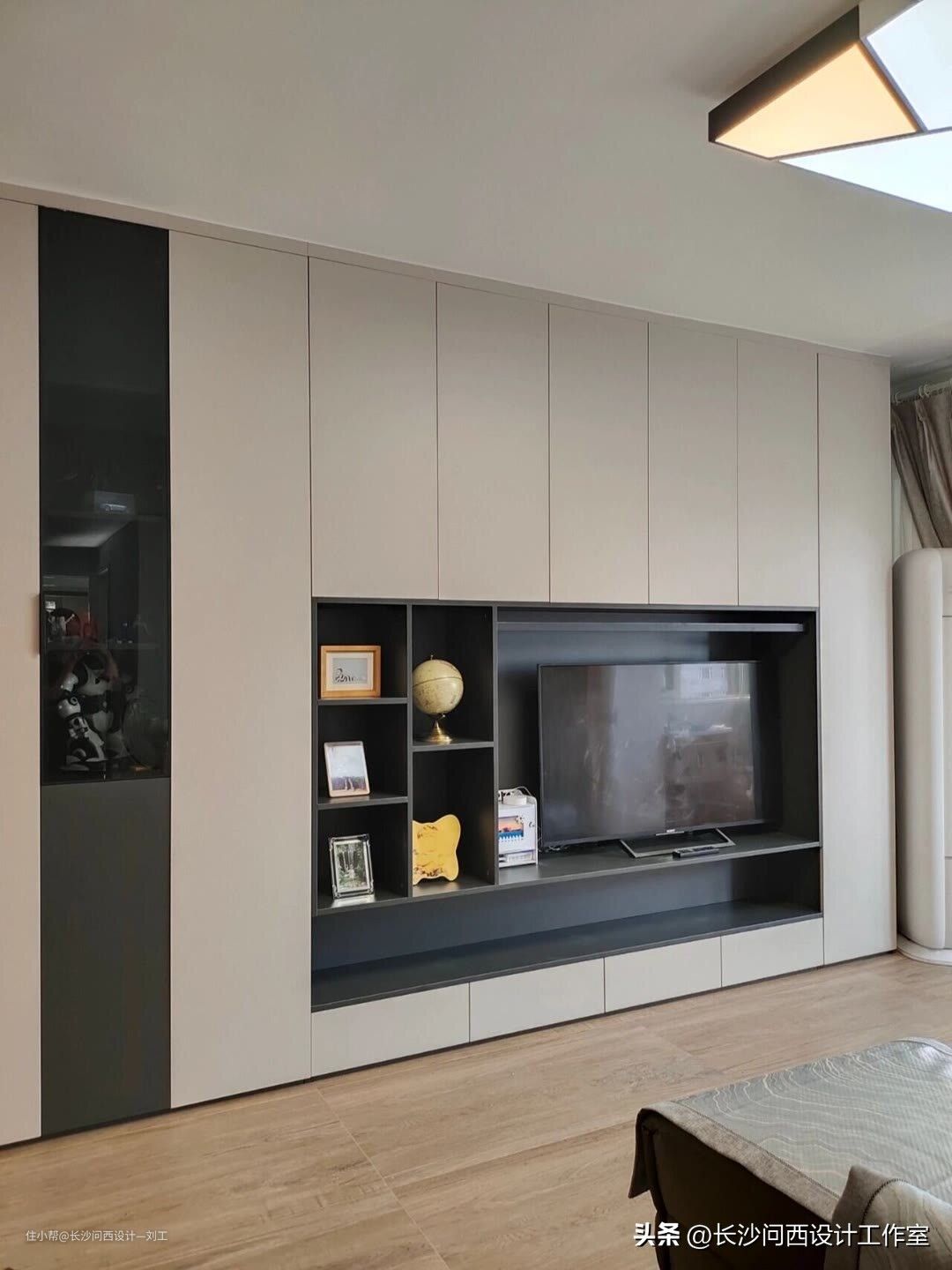 第四种,电视柜到顶,电视柜需要到顶设计,不要留一个空格,这样整体感不仅做不到简洁,而且留一个空格也多一个卫生死角。
