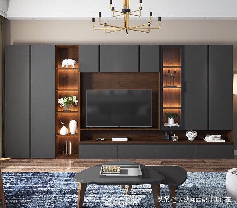 第六种,柜子的设计也要注意下灯光的设计,电视柜与顶面灯光的关系,顶面灯光和柜子的灯光都要恰当好处。否则看上去就很鸡肋。