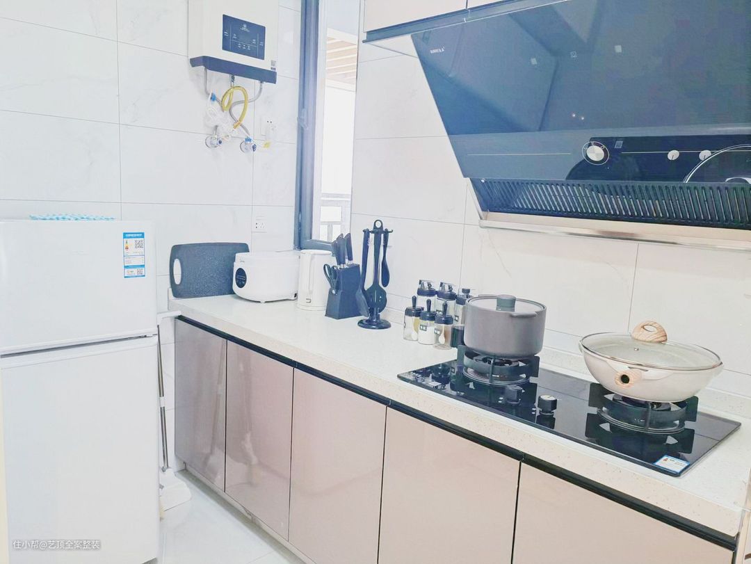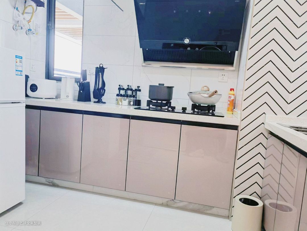 厨房安装浅色白色瓷砖,营造出温馨舒适氛围,让下厨的时光变得心情愉悦,L型厨房小户型标配,流线线条让整体更加便捷香槟色的橱柜、台面和瓷砖相得益彰,颜色干净自然!