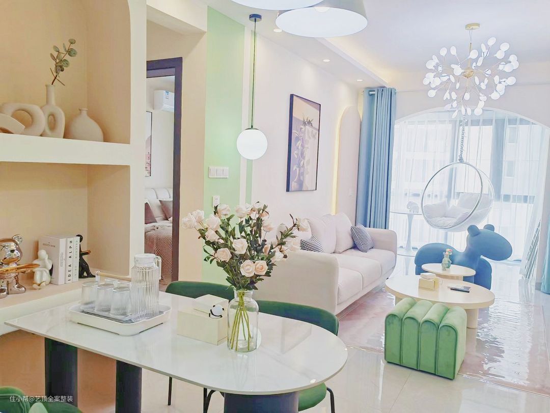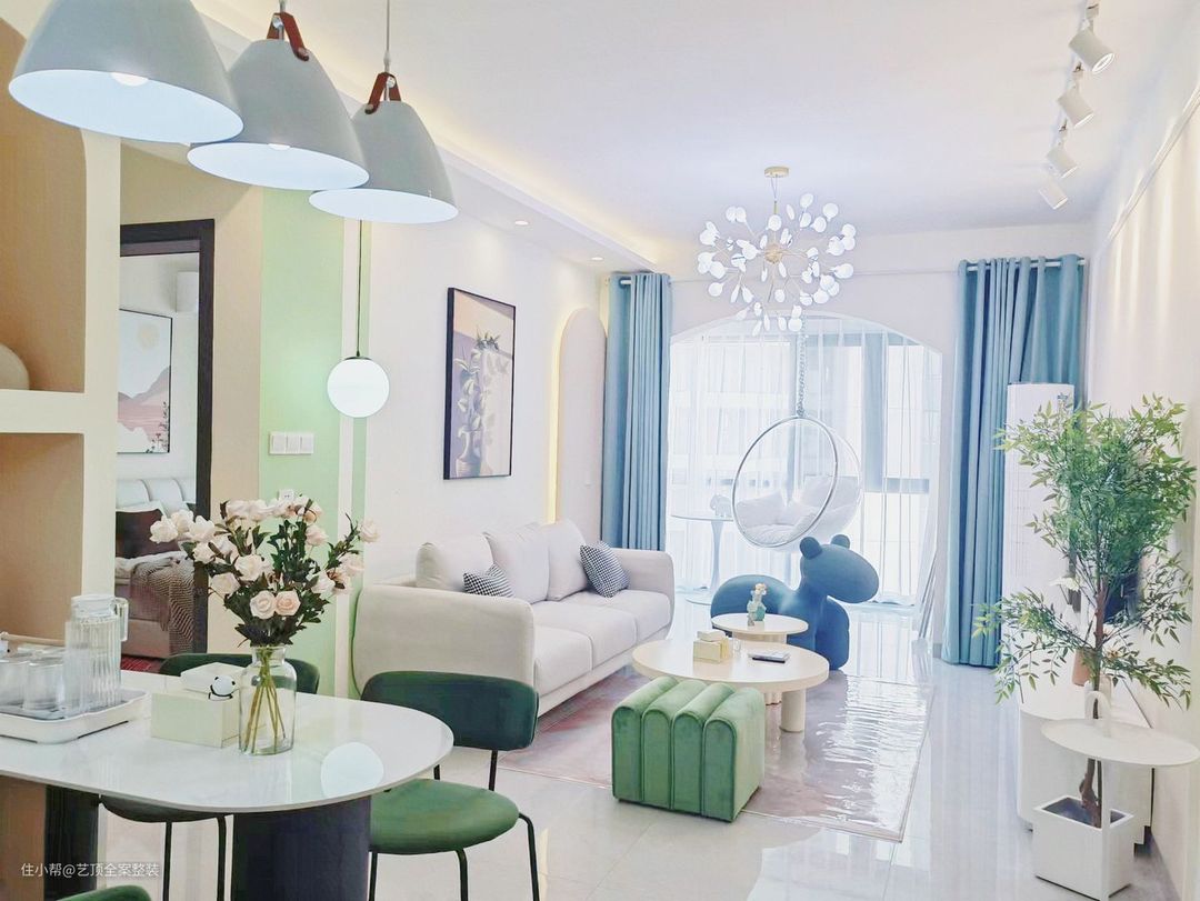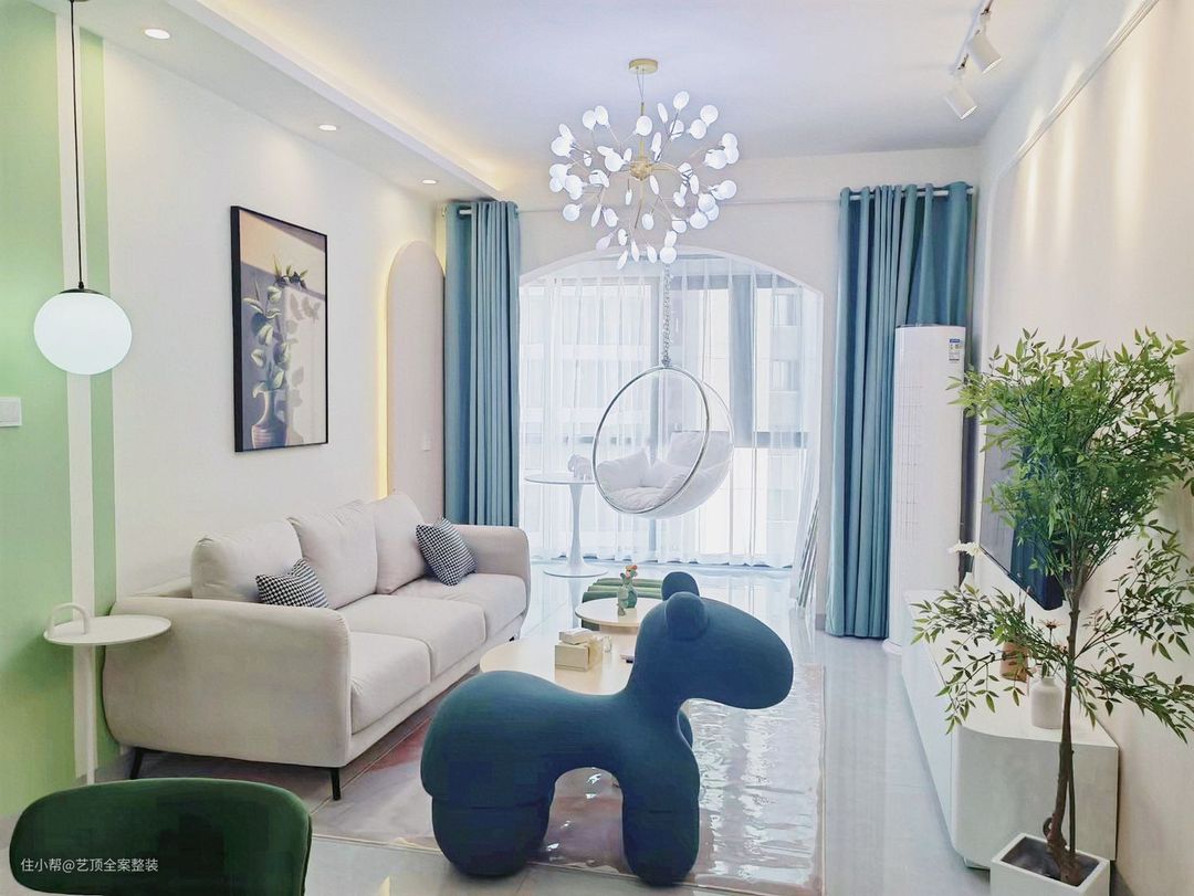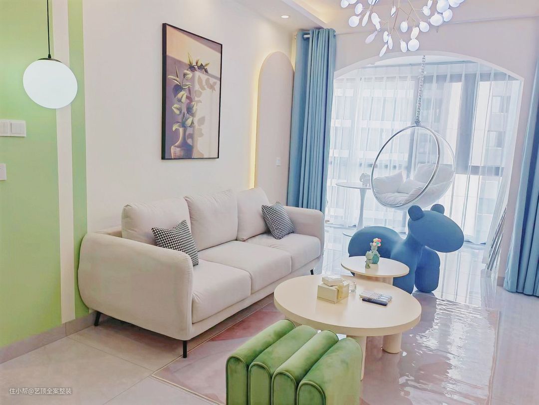几处雾霾蓝的玩偶独凳搭配薄荷绿独凳的点缀,灵动的空间视觉,避免了冷色的单调和冰冷。 将阳台空间融入客厅,让客厅更加宽敞通透。