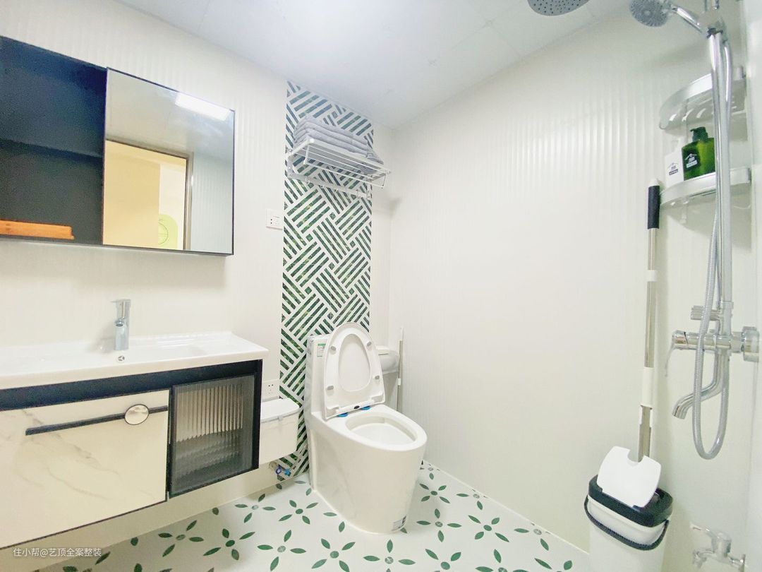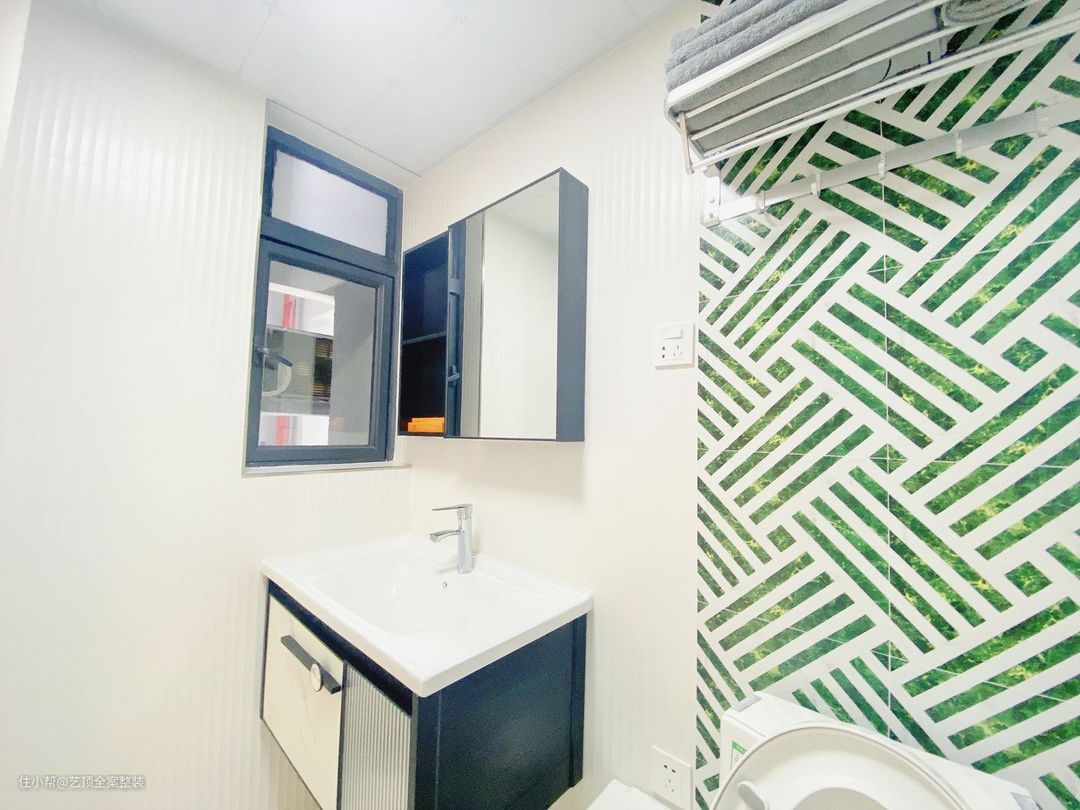 客厅卫生间浴室的采光不是很好,绿白条纹的墙面瓷砖在视觉上起到了很好的延伸空间的作用,让空间显得宽敞明亮。 搭配同色系波点瓷砖,整体充满小清新仿佛置身度假氛围