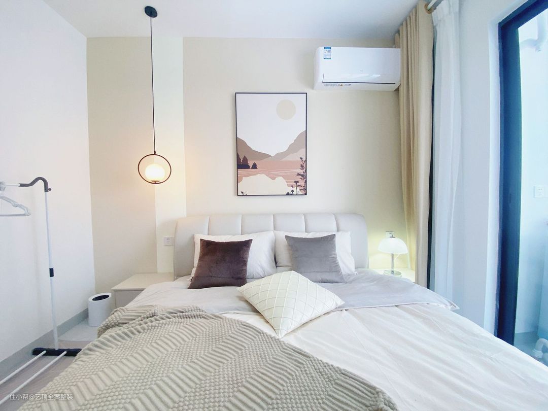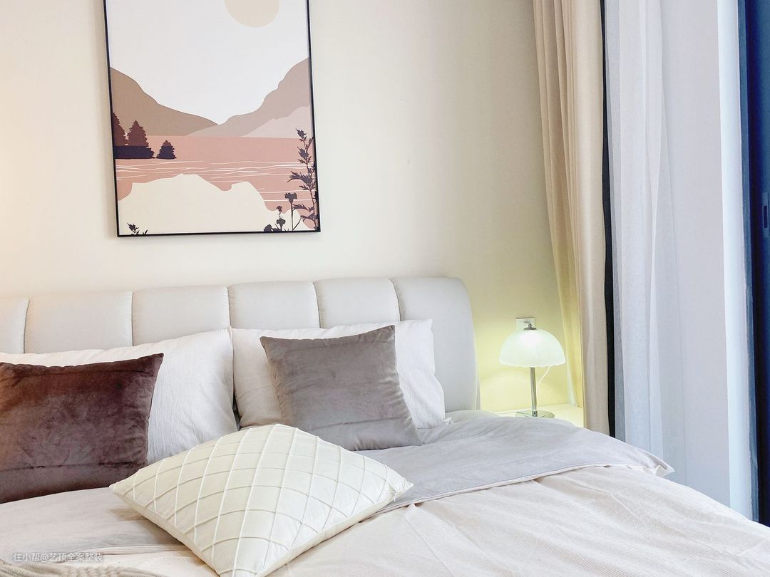 不同于客厅的清新薄荷绿的大面积运用色彩,卧室更偏向于温柔的莫兰迪色系,搭配棕色系山水艺术挂画,和浅色系乳胶漆形成层次感