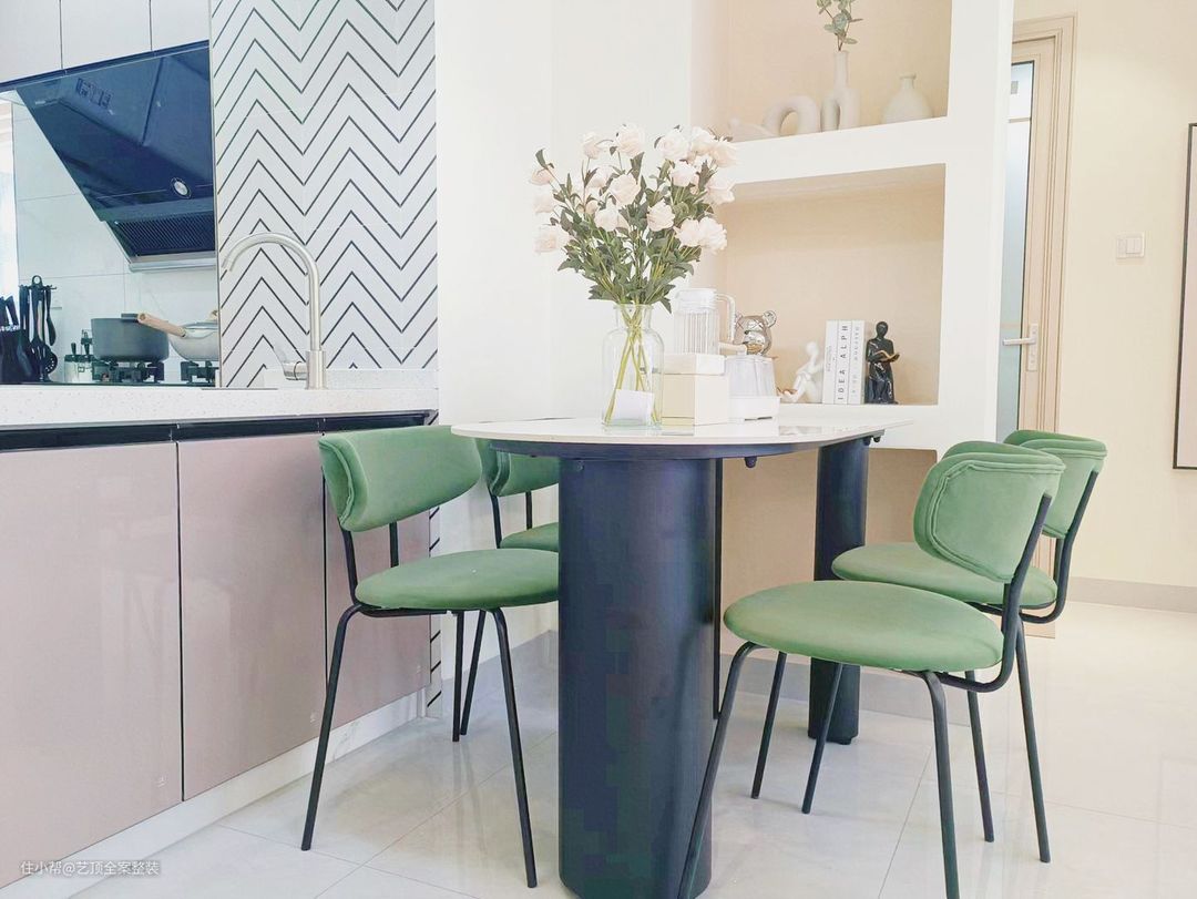 餐厅延续客厅的整体风格,白玉西餐椅搭配薄荷绿用餐凳,干净、温馨、田园,营造清新的就餐环境!一束新鲜的花束,成为整个中心的点睛之笔