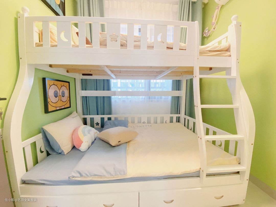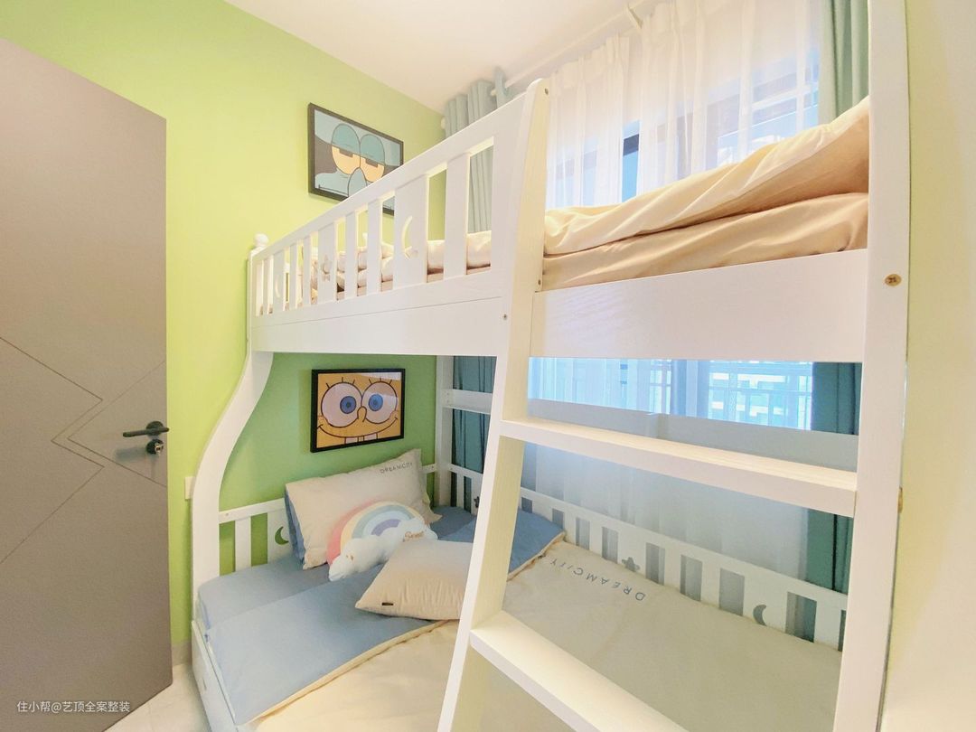 童话色彩浓郁的双人儿童房,薄荷绿墙面,搭配花卉和象牙白上下床,让家更有森林的感觉,适合二孩家庭