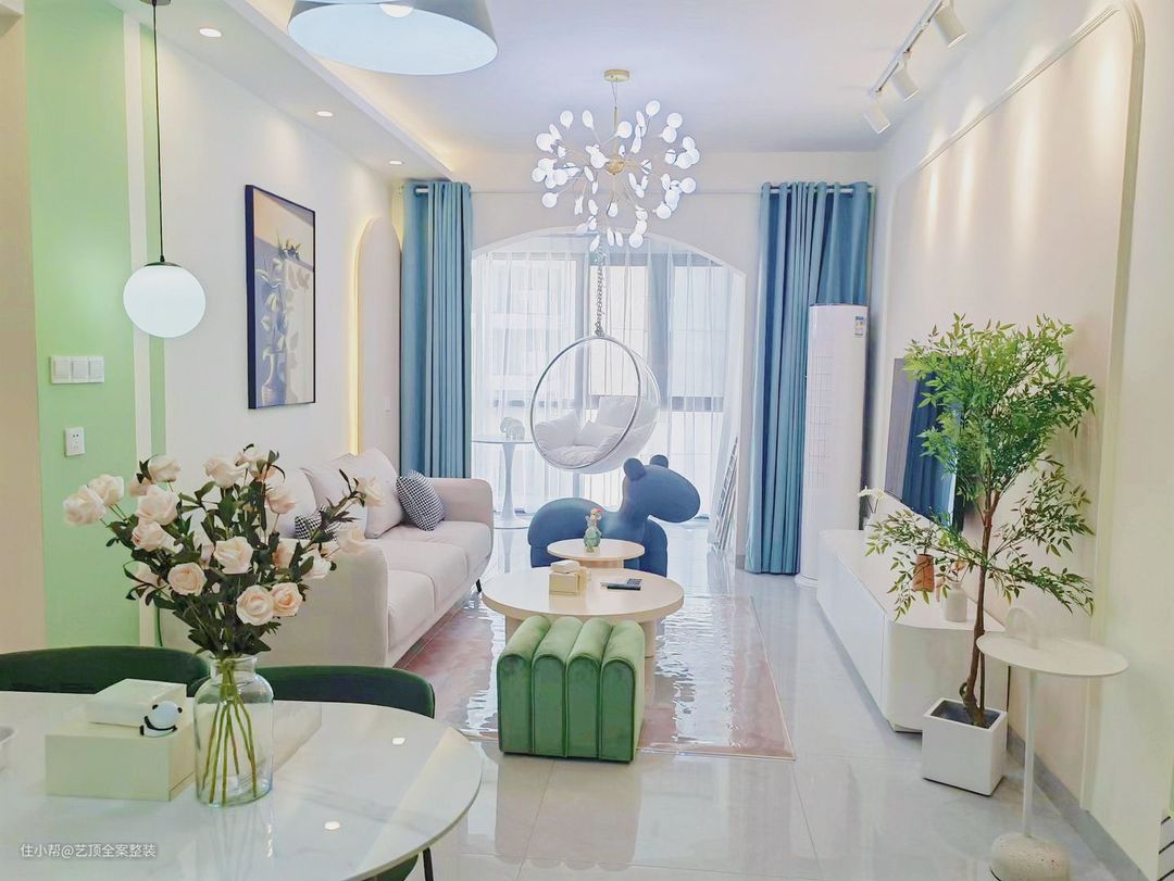 在软装方面整体是做了加法的,浅色系硬装搭配莫兰迪色系软装,做了牛油果绿+薄荷绿+断面天鹅绒蓝和整体花卉植物的搭配