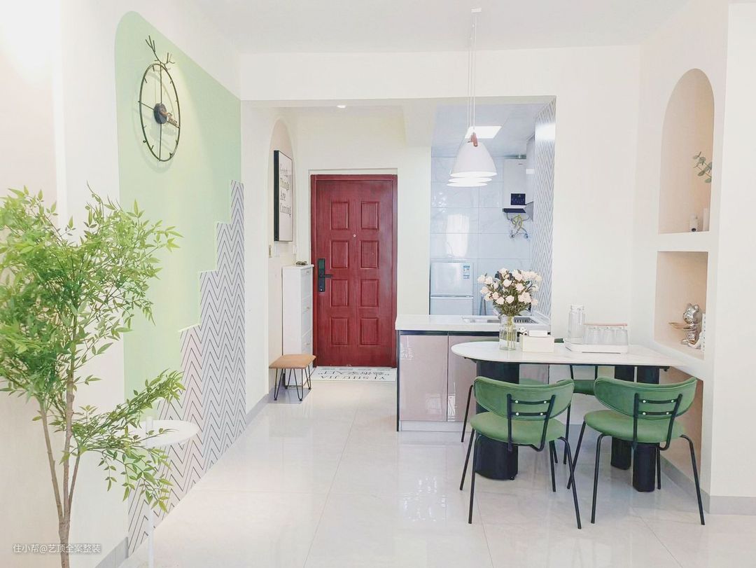 一进门,一抹薄荷绿映入眼帘,犹如一股清水浸润心间,疗愈着美好的家,从进门的那一刻起就能感受到。简易式玄关满足日常进门换鞋的需求,下方留够空间置换鞋子等物件 玄关处的简易式鞋柜,与客厅整面薄荷绿乳胶漆墙面,形成一种色彩对称。 客厅奶白色的沙发搭配高低茶几,显得活泼活泼。 沙发背景墙上的网红画,营造出时尚优雅的氛围。