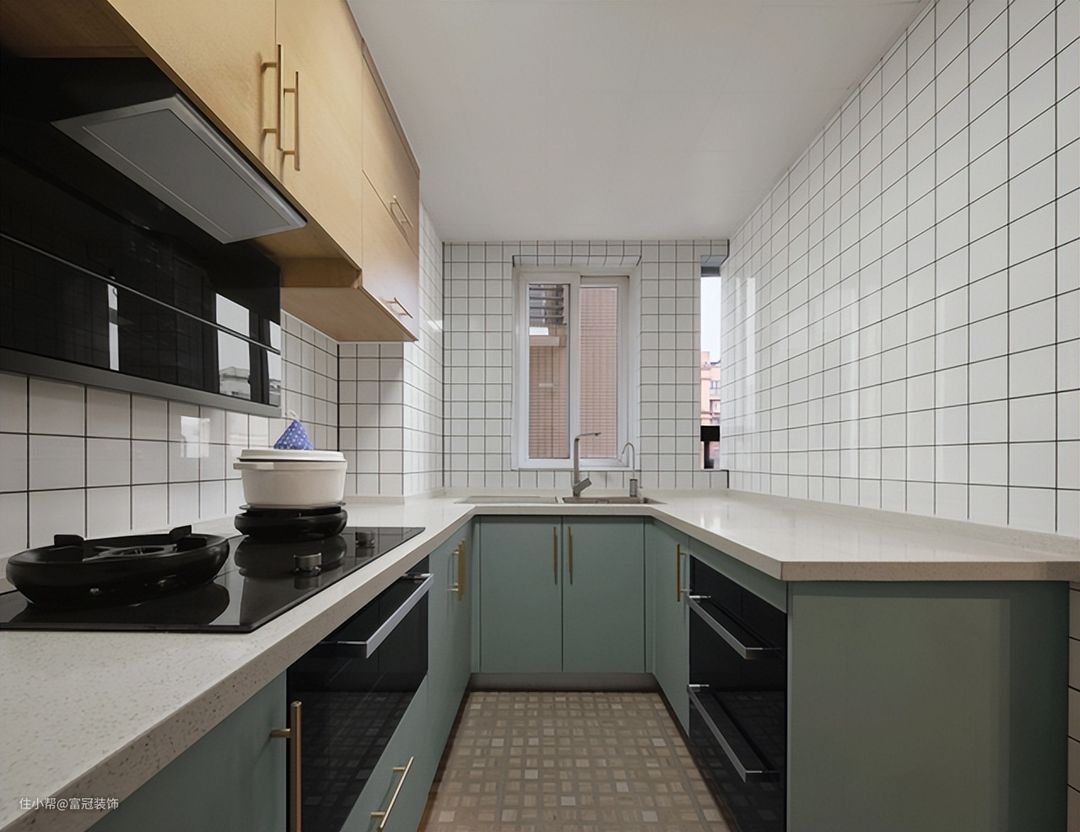 原木色橱柜、豆蔻绿橱柜、经典的白色小墙砖,视觉上简洁干净,透露出些许复古质感。