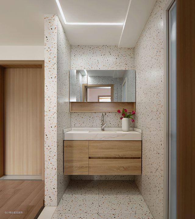卫生间采用普通干湿分离布置。干燥区域的墙壁和地板铺设了统一的水磨石瓷砖,以使空间干净整洁。间接性在扩大空间感方面发挥了作用。
