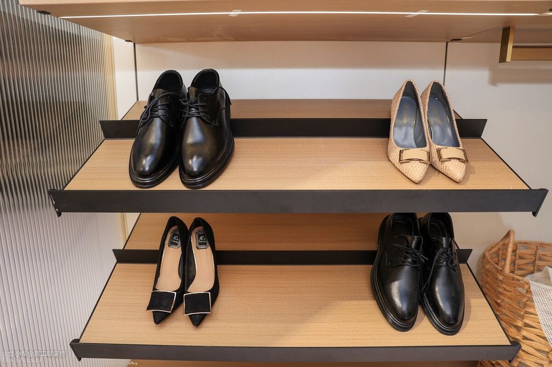 鞋柜的深度以35cm为准,进深达到40cm的话,鞋盒也能放进去,如果玄关高度有限,没办法放置35公分深的鞋柜,可以使用斜式层板设计,即便是20公分深的鞋柜也能放得下鞋子,深度大于40公分的话,真的很浪费空间。