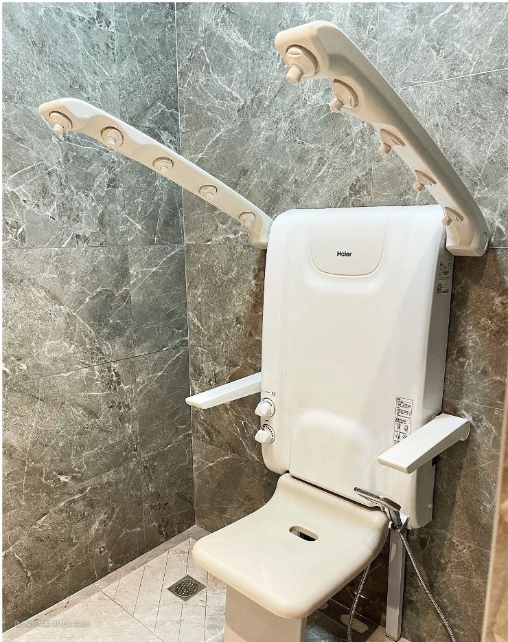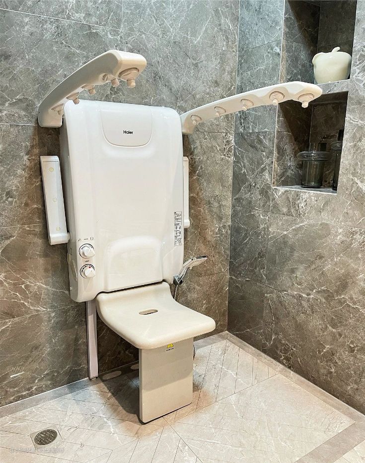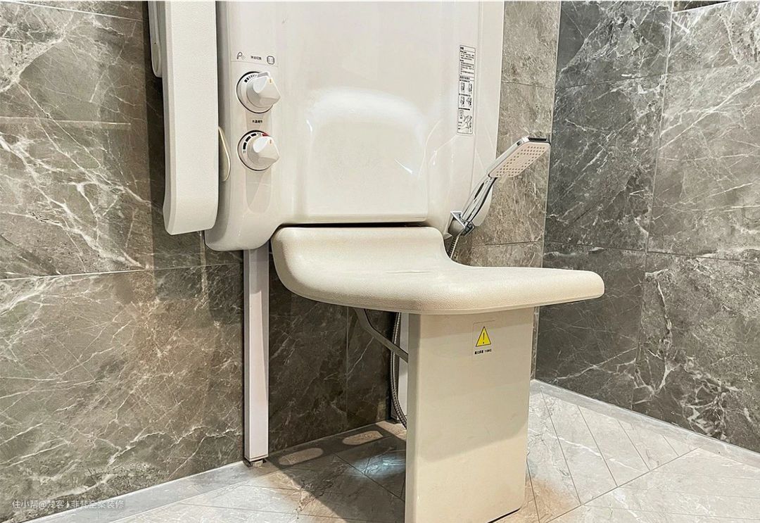 - 老人腿脚力量不足,洗澡时最好有坐的地方,安全又舒服。坐浴器,平时收上去,使用时放下来,非常方便。坐浴器两边的把手可以出水,靠背符合人体工程学设计,扶手还能借力起身。