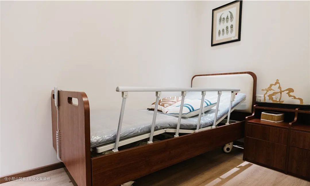 对于需要特别护理的老年人,功能性床铺很有必要。床头可以摇起来方便老人坐着,扶手可以借力起身,滚轮方便床的移动。最好也为陪护人员准备一张床。
